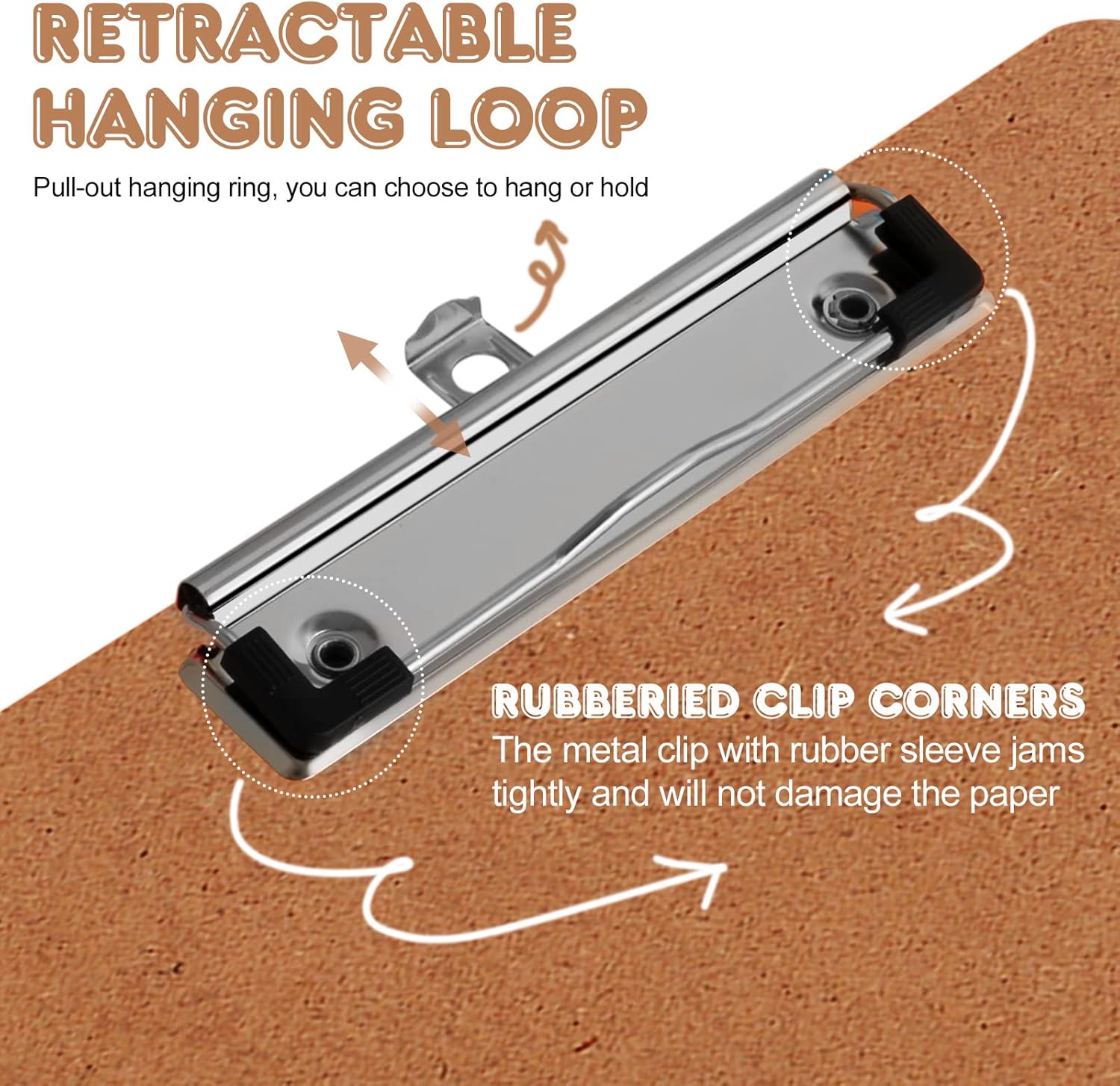 - ✅RETRACTABLE HANGING LOOP: The clipboards have a built-in hanging hole, which can help you place your documents randomly. And it can be stowed away when not needed