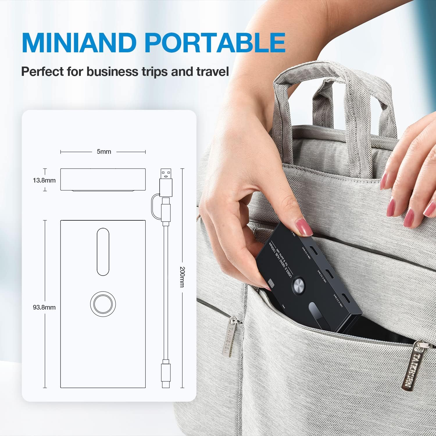 - 【Compact Size】The HUB body is 3.9 inches long, 2 inches wide and 0.55 inches thick, which is about the same thickness as a mobile phone. The length and width of the hub are slightly larger than that a credit card. The cable can be detachable from body, which is not only suitable for desktop use, but also very convenient to carry.