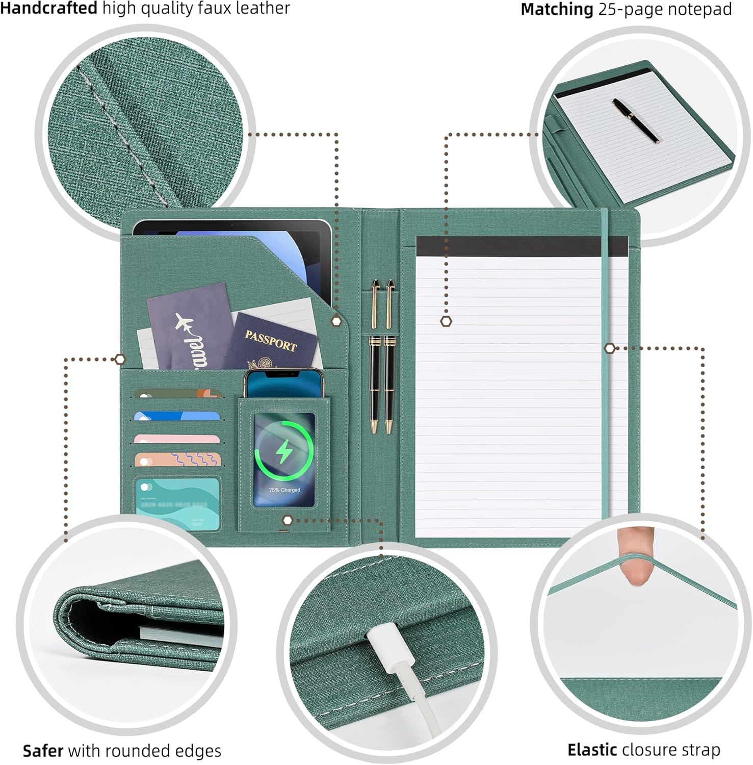 - ✔Powerful and Organized Storage: Our portfolio folder is 360°ー foldable and features a retractable transparent phone pocket (with a charging port) that can accommodate a 6.7-inch phone. The portfolios also have 4 card areas next to it. The right side of the leather portfolios has a large pocket and a matching notebook. The versatile pocket design is perfect for all your daily use and business travel needs.