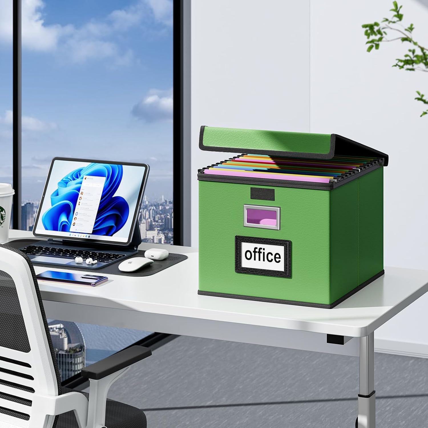- Portable Filing File Cabinet for Home/Office- The outer box with leather can be dustproof, inside and the bottom support is made of thickened cardboard, which is environmentally friendly and not easily deformed. The cover with Velcro not only allows us to cover the file box easily, but provides more storage space for the file and folders. It also acts as a small filing cabinet for tax documents, legal files and other documents storage. When we are not using it, we can fold it up to save space.