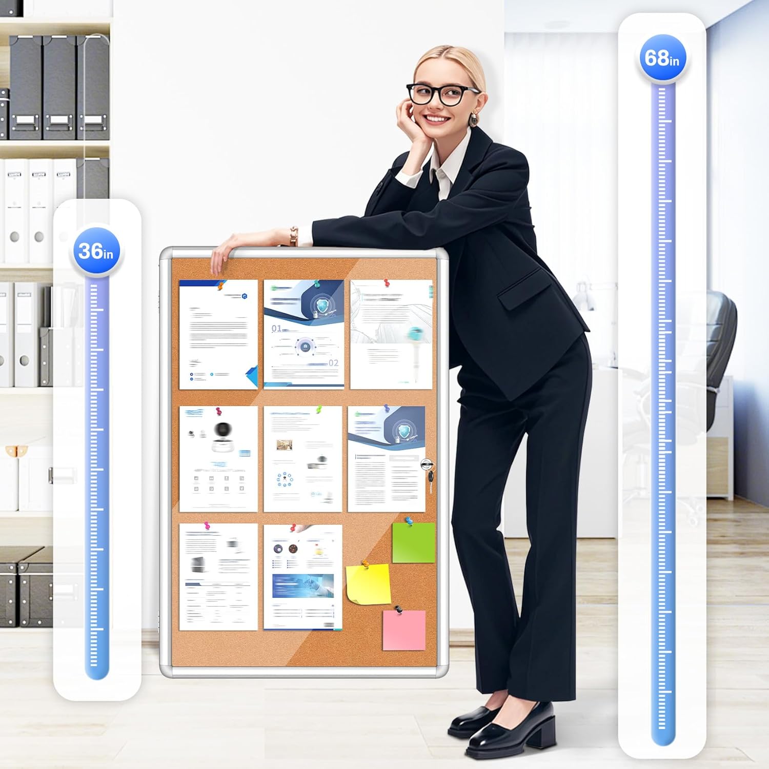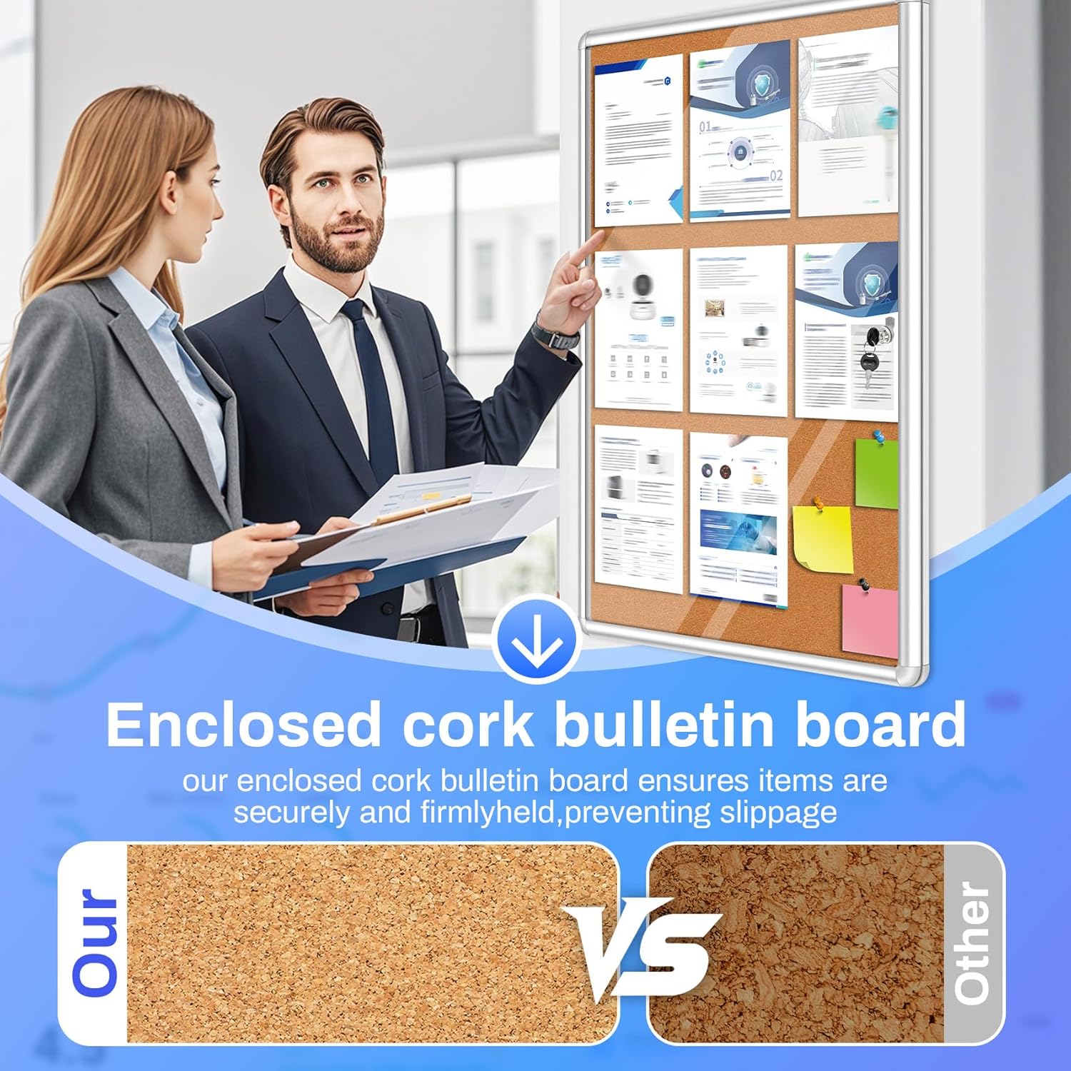 - ECO-FRIENDLY MATERIAL: Enclosed bulletin board made of soft, resilient, and self-healing Natural Cork that can withstand repeated use of pins or Velcro without distortion.