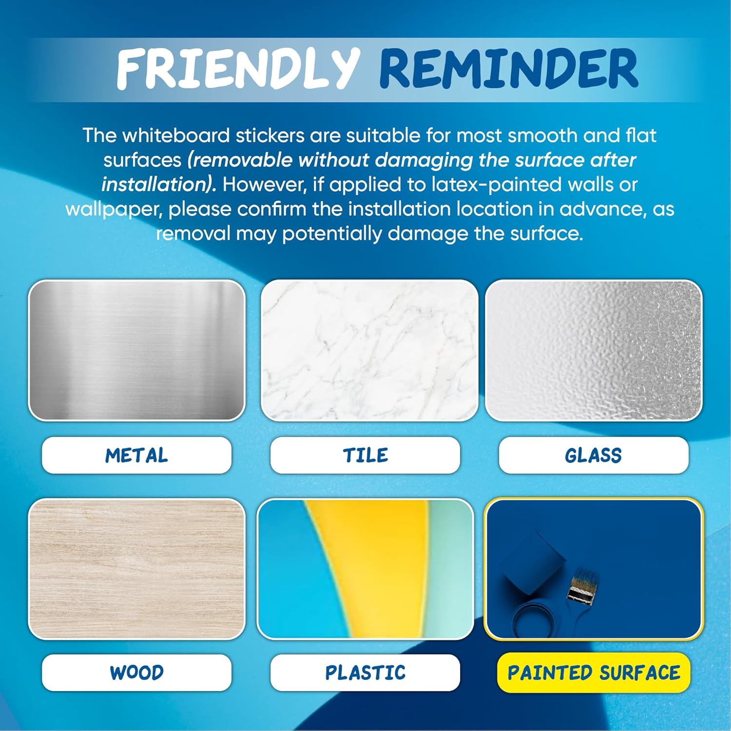 - WARRANTY & TIPS - If you are not 100% satisfied with our magnetic dry erase board paper, please email us before taking any action, we will solve your problem within 24 hours to avoid unnecessary losses. ( Note: Can be firmly applied to wallpaper, latex painted walls and other fragile surfaces, but will damage the wall when removed ).