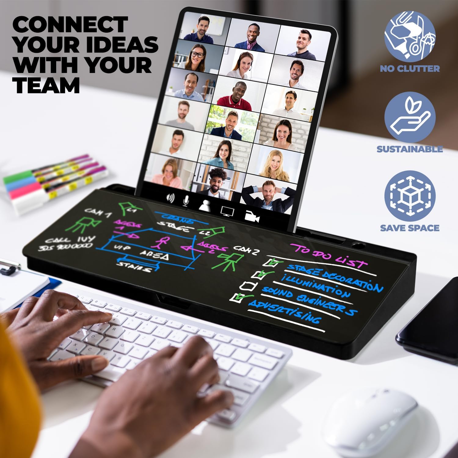 Desktop Dry Erase Board - Glass Erase Board - Black Desk Computer Buddy – Home Office & Studying Essentials - Phone & Tablet Slot, Storage Compartment - Includes 4 Markers, 1 Eraser.