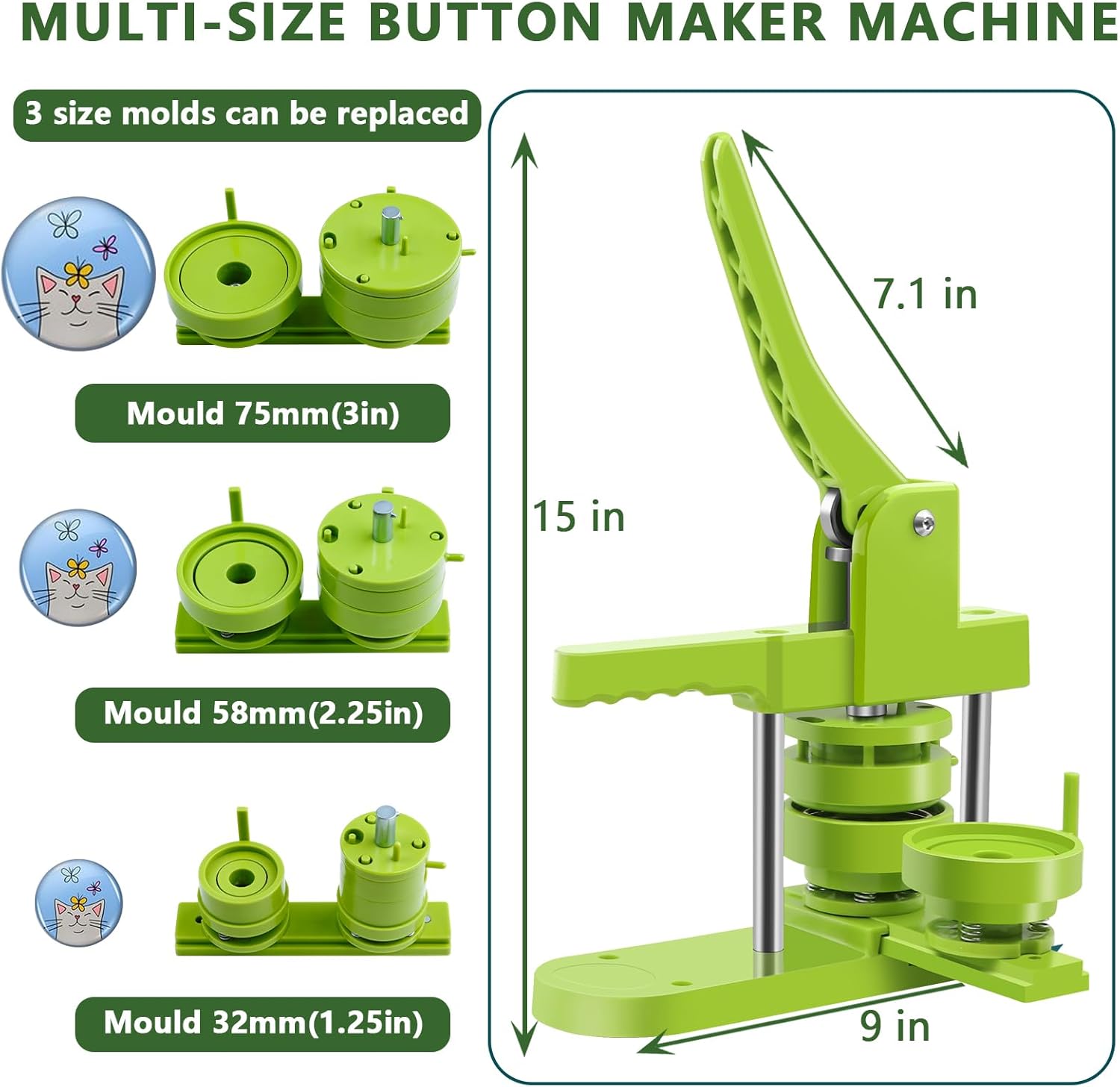 - 【MULTI-SIZE ADAPTATION, UNLIMITED CREATIVITY 】Multi-purpose machine, industrial plastic button maker machine set provides a body and three different sizes of button-model: 1.25 inches (32mm), 2.25 inches (58mm) and 3 inches (75mm). The button press machine can switch button-model sizes at any time to meet the needs of different sizes of buttons, unleashing unlimited creativity!