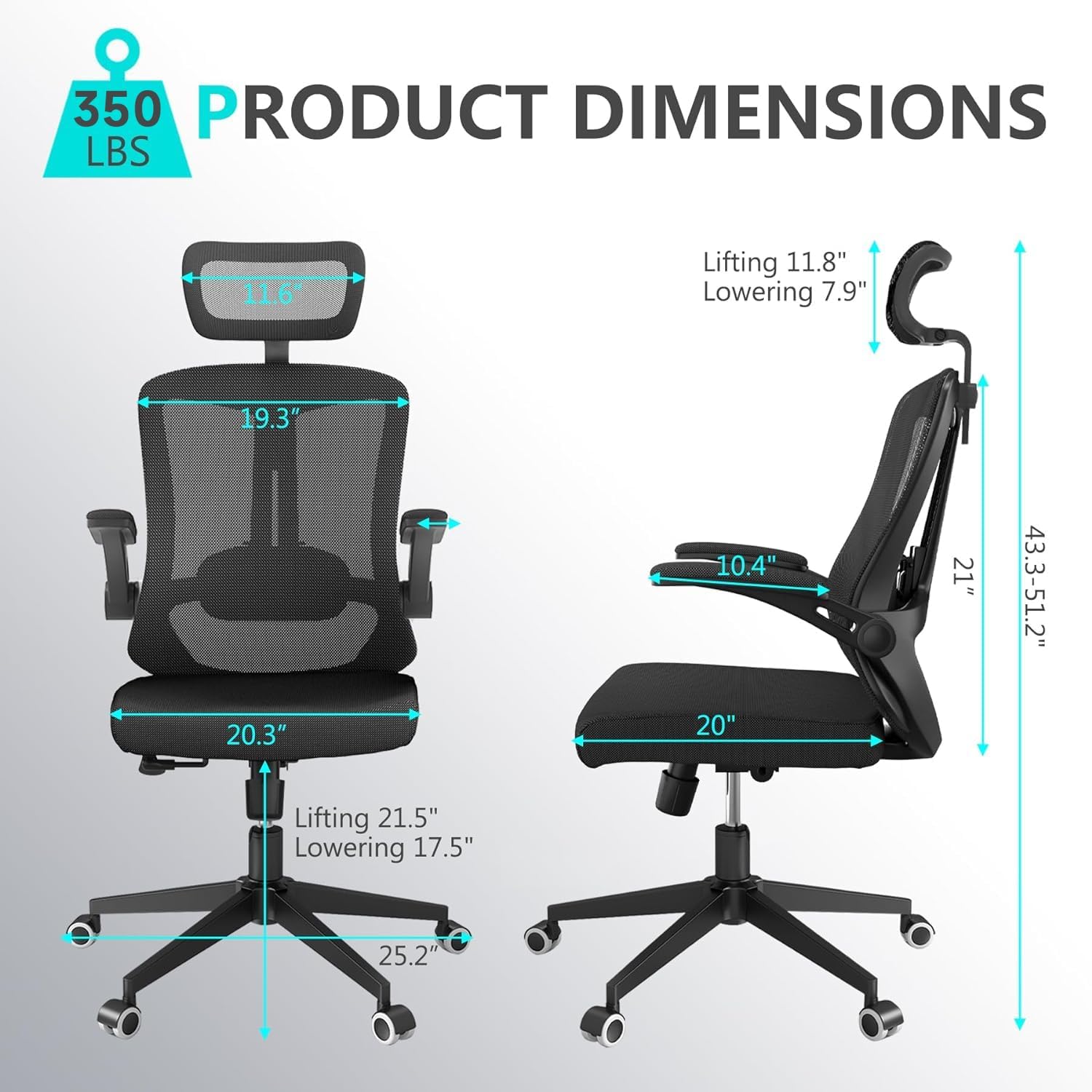 Comfy Office Chair, Home Ergonomic Desk Chairs, High Back Gaming Mesh Computer Chair with Wheels, Lumbar Support, Adjustable Headrest, Flip-up Armrest 350LBS Capacity
