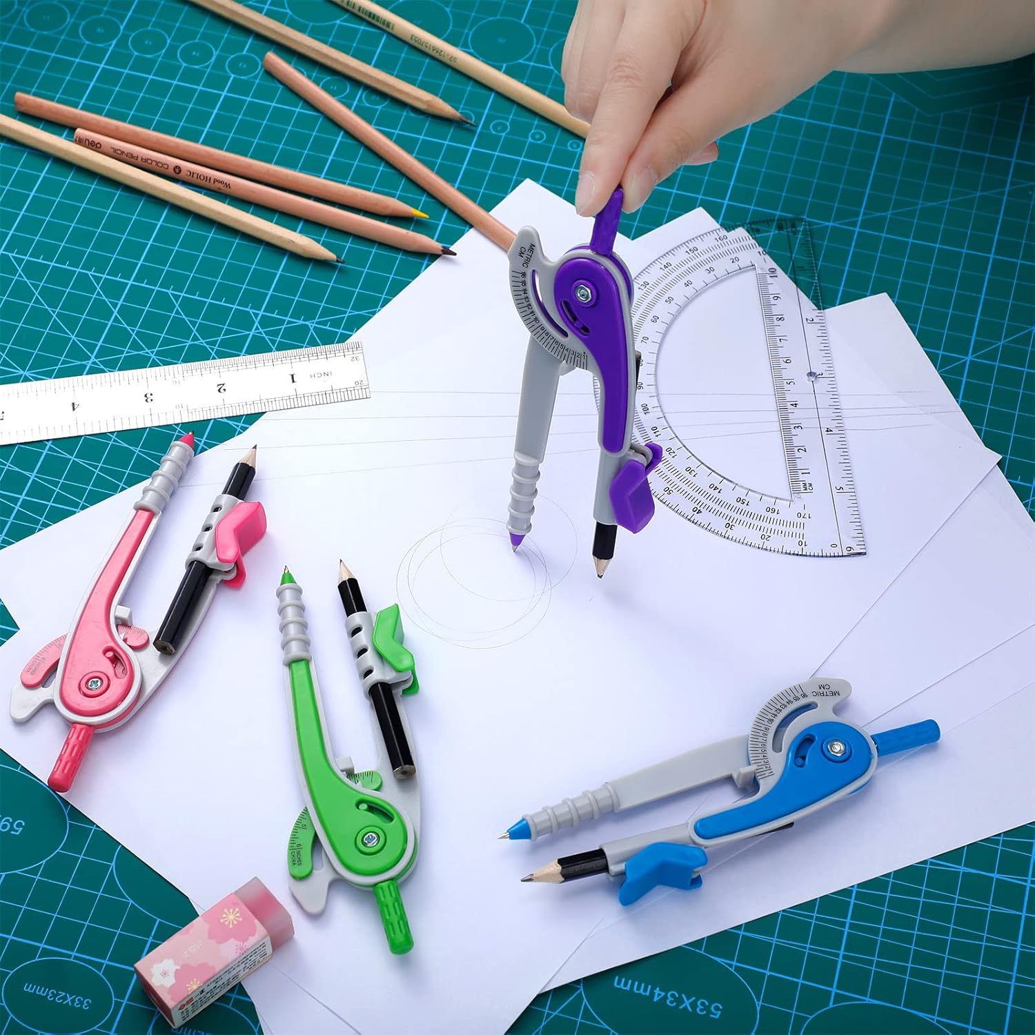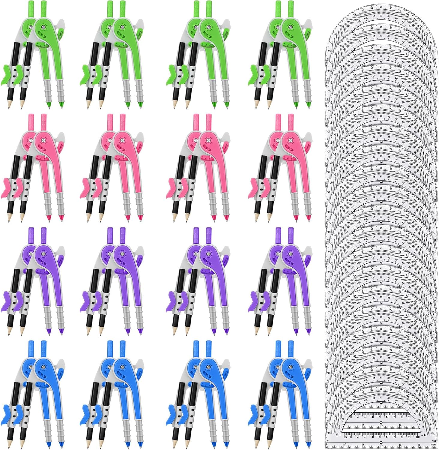 - What You Get: the package includes 36 sets of geometry kits, including 36 pieces of protractors and 36 pieces of compasses with 36 pieces of pencils, there are 4 different colors of compasses, green, pink, purple and blue, allowing you to choose as you like