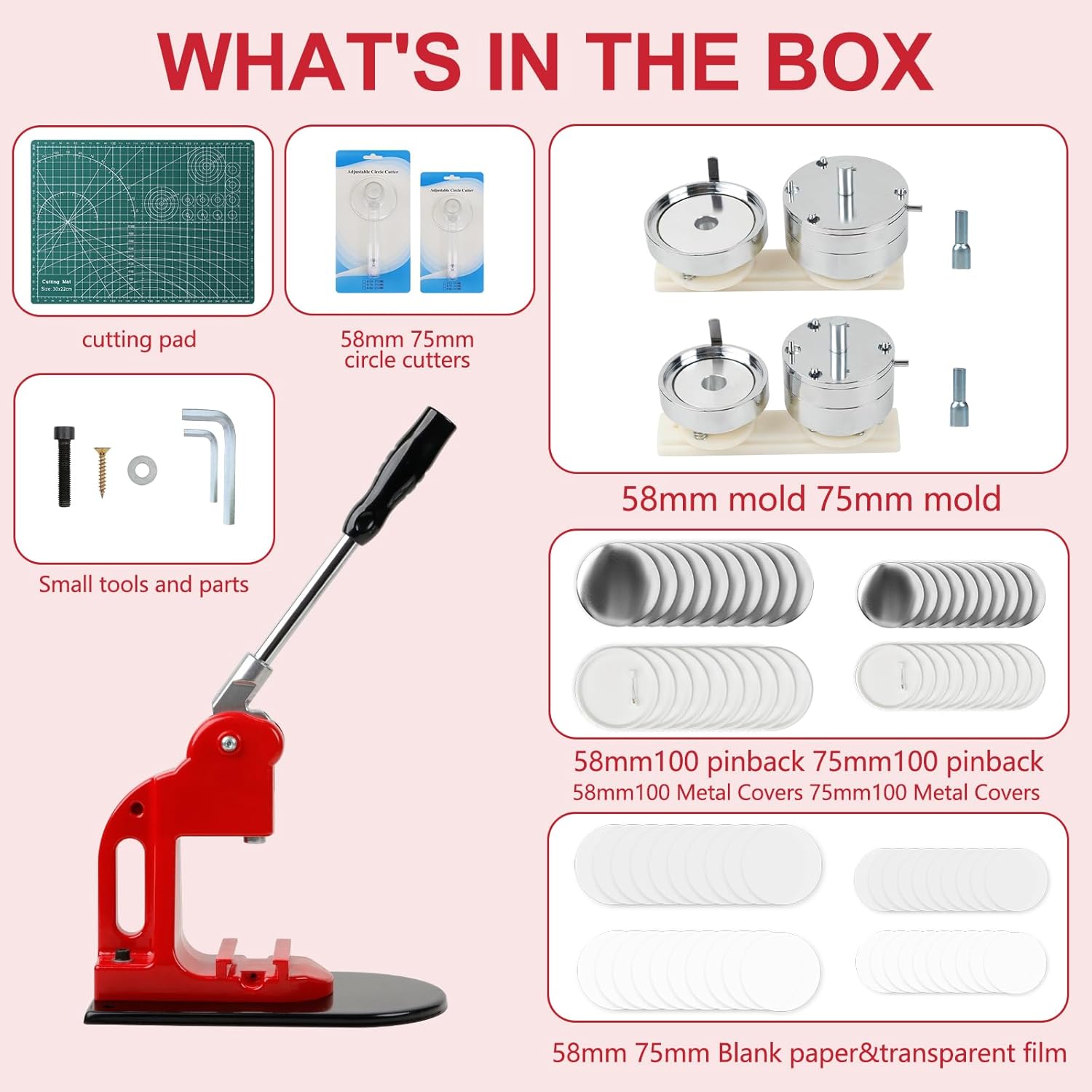 - 【MULTI SIZE BUTTON MACHINE SET】Button maker machine kit includes, one metal body, one set of 58mm die, one set of 75mm die, 100 sets of 58mm button parts, 100 sets of 75mm button parts, comes with round cutter and cutting mat. With this button making machine set, you can effortlessly and quickly complete the production of badges.