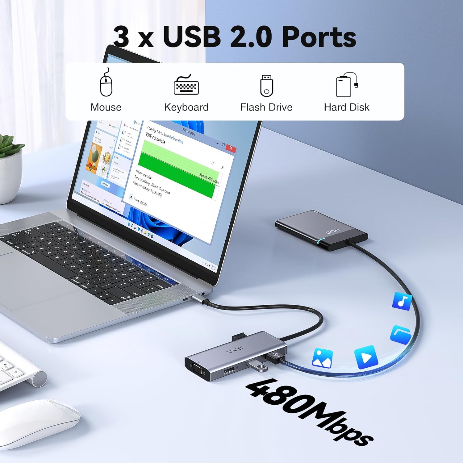 - USB C Docking Station 7 IN 1 Multiple-display : With docking station, you can easily convert your laptop from one USB C port-thunderbolt3/4-adapter into 7 Ports: dual HDMI 4K (1*60HZ & 1* 30HZ), 1*60HZ Displayport, 1*1080P VGA and 3* USB 2.0.No need any drivers or software, just plug and play. Note: This usb c hub compatible with laptops with a Full-featured USB Type-C port (support DisplayPort,charging,data transfer protocol), the incompatible device cannot use the (HDMI&DP) of this Dock
