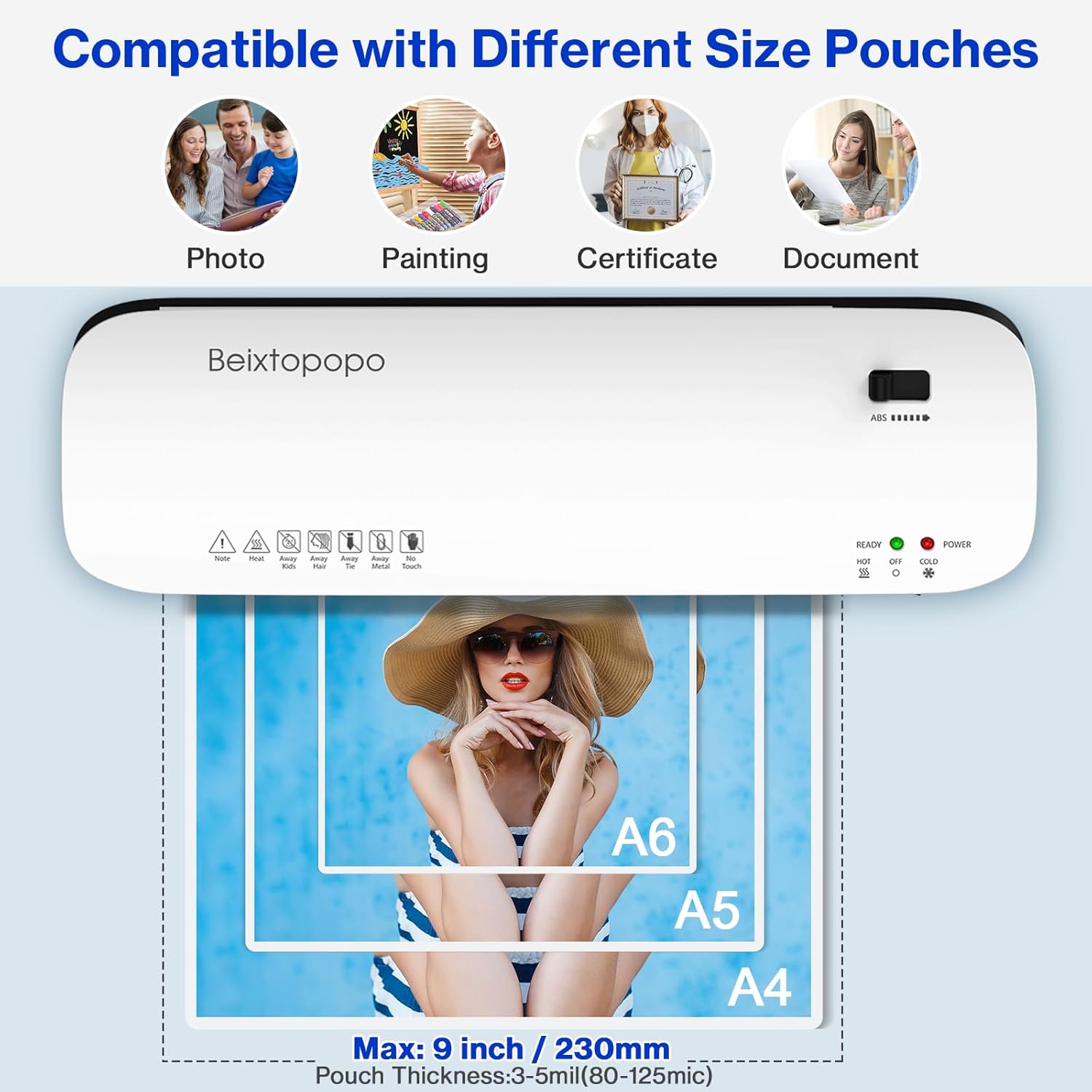 - 【Wide Lamination Application】The 8.5x11 thermal laminator machine is suitable for all A4/A5/A6 size paper,photos. It effortlessly handles popular sizes like letter size and business cards. It helps you to cherish your memory and protect your important documents from water, dirt, fading, scratches or tears. Make sure to choose pouches with a thickness of 3-4.5mil (80-100mic) for optimal lamination results.