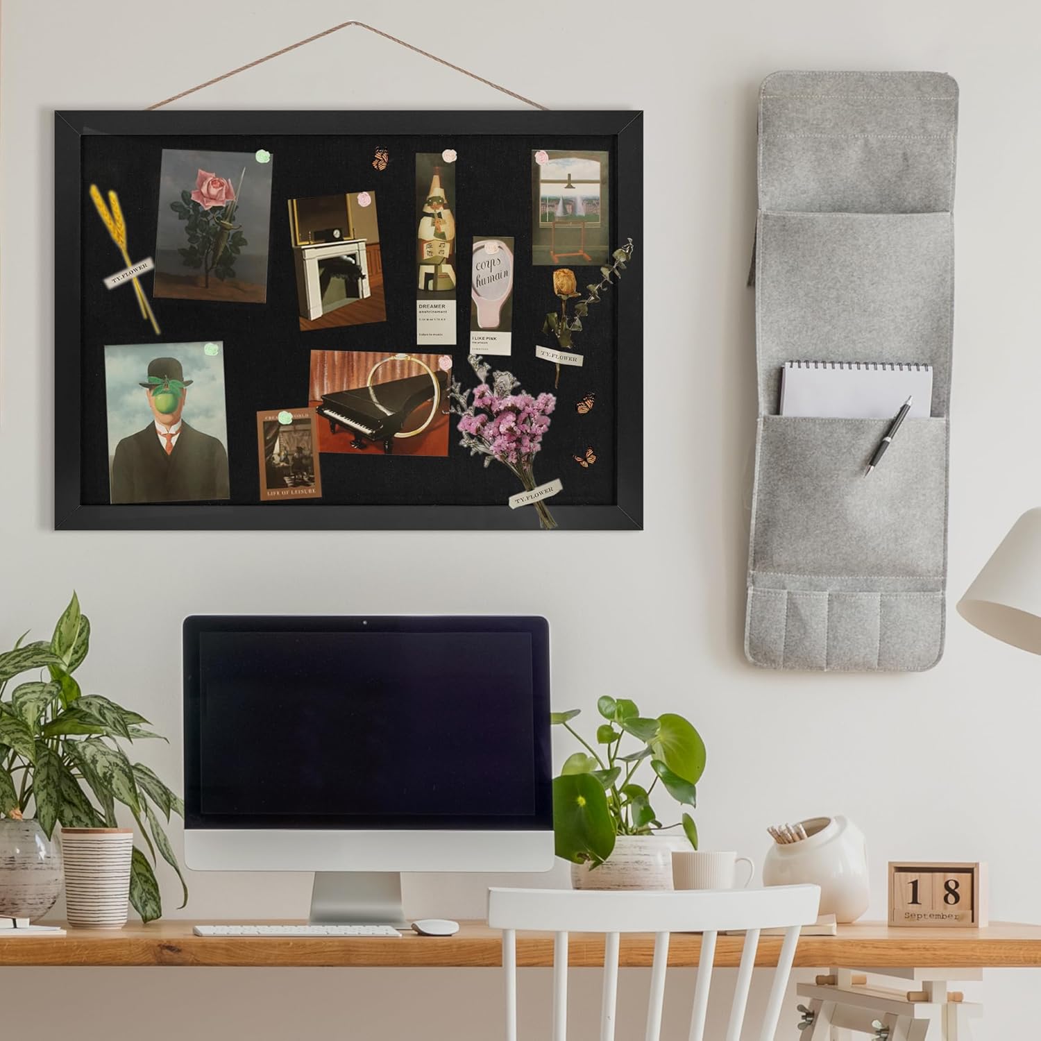 Black Cork Board Bulletin Board 16.7" x 11", Small Linen Corkboards with Frame for Walls, Cute Picture Display Pin Board Vision Board for Room School Office Bedroom 8 Pushpins