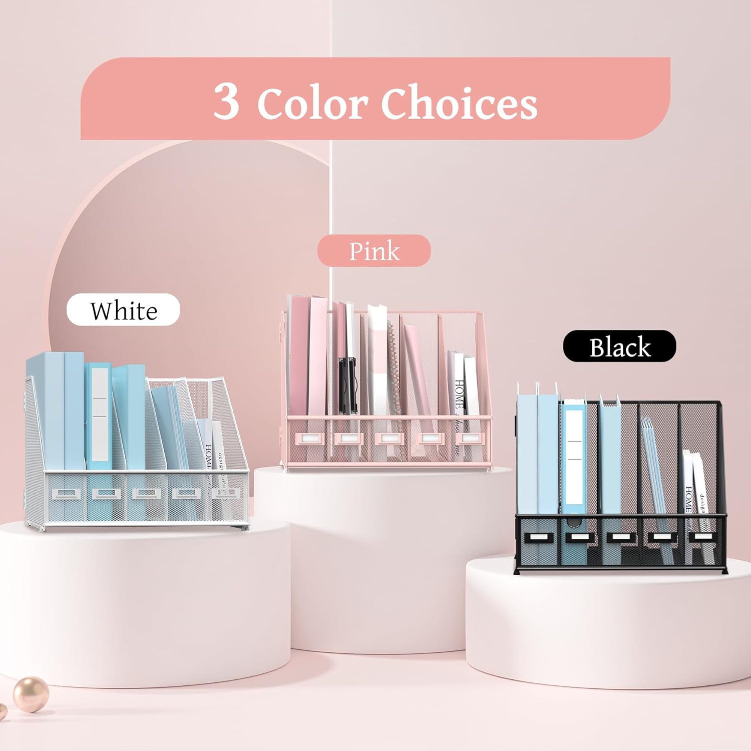 SUPEASY Desk Organizers Metal Desk Magazine File Holder with 5 Vertical Compartments Rack File Organizer for Office Desktop, Home Workspace, Pink