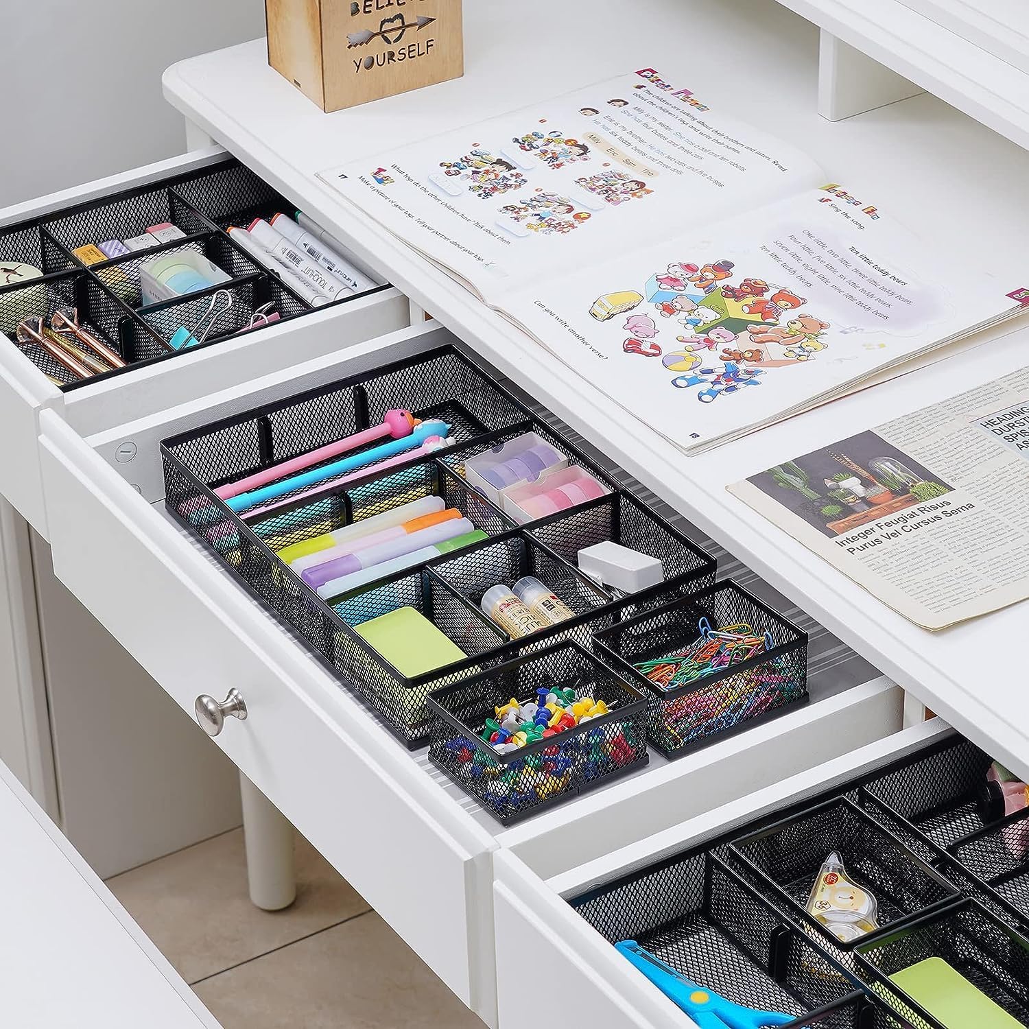 - 【Customizable Compartments Size】The 6 removable dividers can be combined in any size you need to fit different stationery such as pens, erasers, highlighters, notes, staplers, tapes, clips or other supplies.