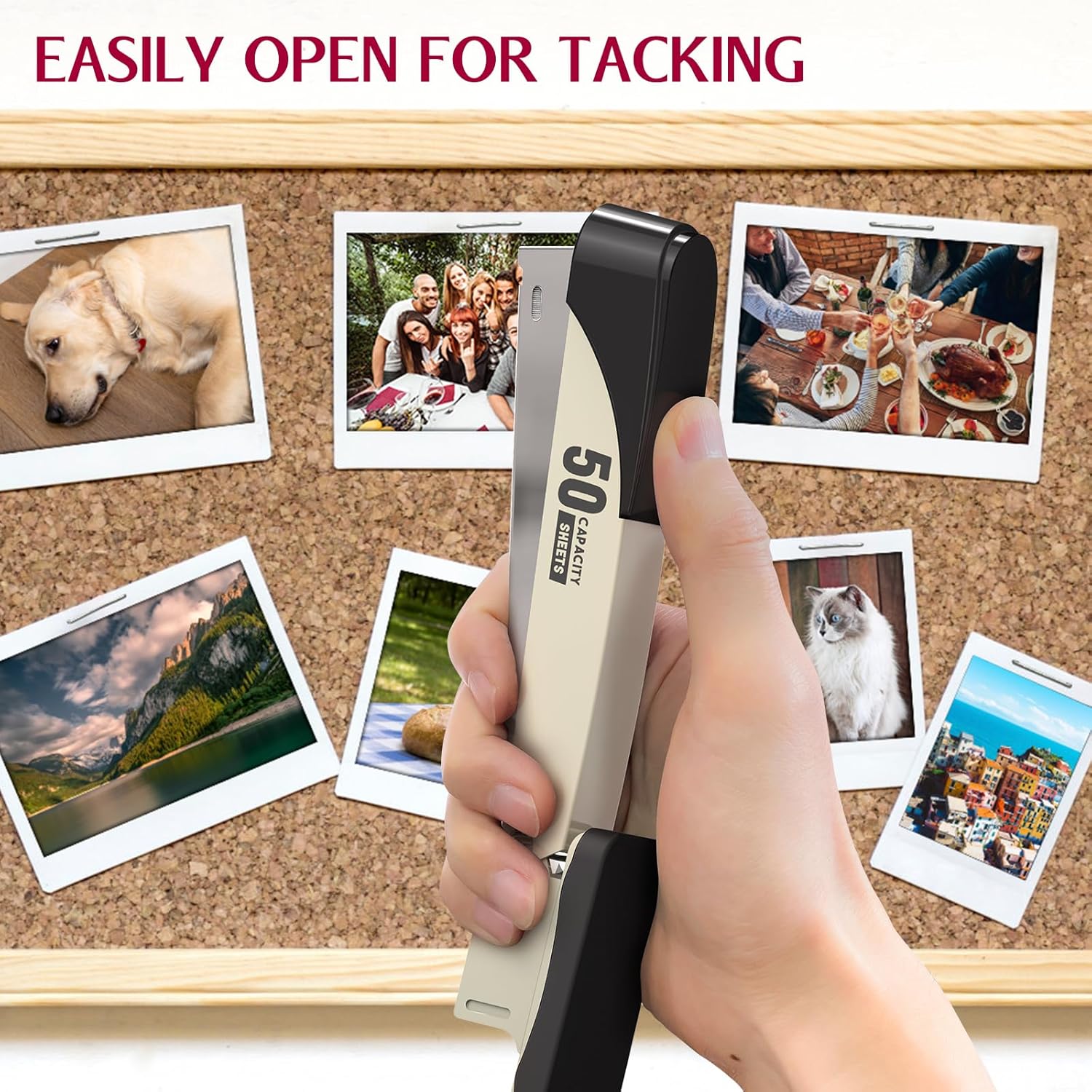 - 【Pinning & Tacking】: You can reverse the anvil for temparary pinning and open the stapler for tacking papers to bulletin boards.