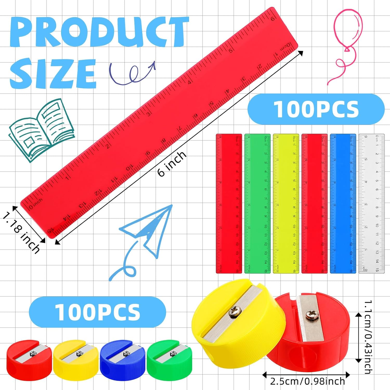 100 Pcs Plastic Rulers and 100 Pcs Mini Round Manual Pencil Sharpener Bulk, 4 Assorted Colors Pocket Sized Pencil Sharpeners Colorful Straight Ruler Back to School Supplies for Kids (Classic,6 Inch)