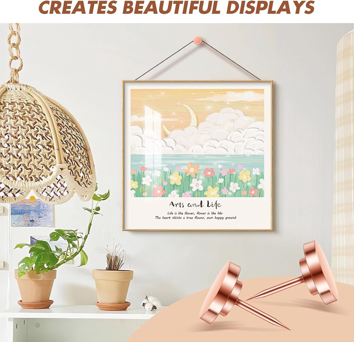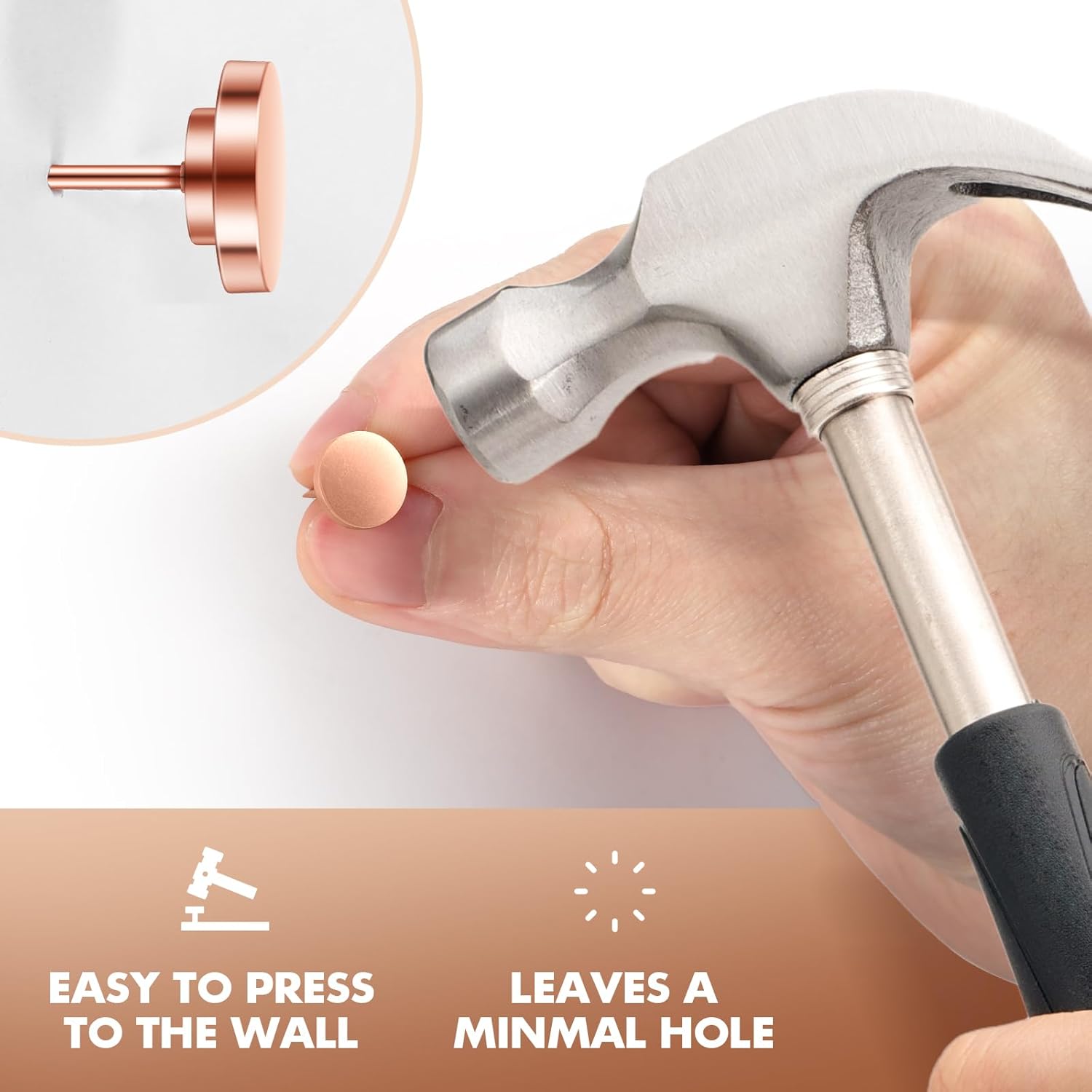 - 【Easy Installation】In the shape of ordinary push pins with rose gold color, these metal push pins are easy to install without causing damage to your walls. Simply tap them in with minimal effort using a picture hanging tool, and you're ready to showcase your favorite wall art or decorations, these metal push pins and picture hanging hooks are perfect for heavy-duty use.