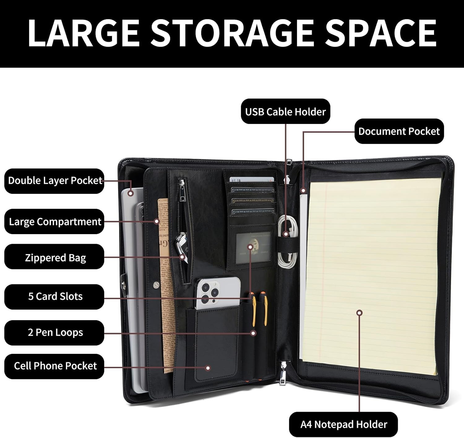 - Ultimate Organization Companion: Spacious compartments for documents. Inside YKK zippered pocket for secure storage. 5 convenient card slots, 2 pen loops for quick access, a dedicated cell phone pocket, and even a USB cable holder. Stay impeccably organized and make a powerful statement in any business setting.