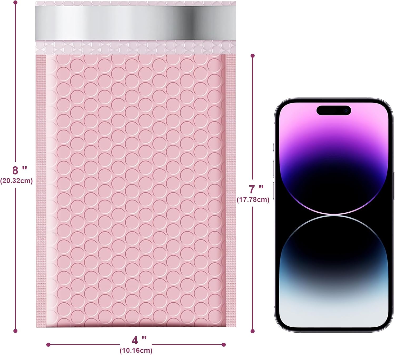 - Compact Private Bubble Mailers-- Usable Space: 4 x 7, Outer Size: 4x8 | Pack of 50 | Color: Pink. Lightweight polyethylene bubble envelopes cut transportation costs and enhance packaging allure with fashionable colors. Crafted from premium polyethylene, these poly mailers offer absolute privacy protection.