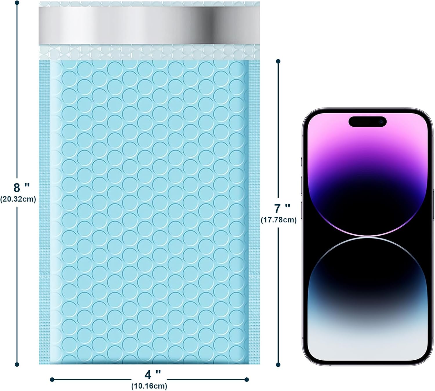 - Compact Private Bubble Mailers-- Usable Space: 4 x 7, Outer Size: 4x8 | Pack of 50 | Color: Light Blue. Lightweight polyethylene bubble envelopes cut transportation costs and enhance packaging allure with fashionable colors. Crafted from premium polyethylene, these poly mailers offer absolute privacy protection.