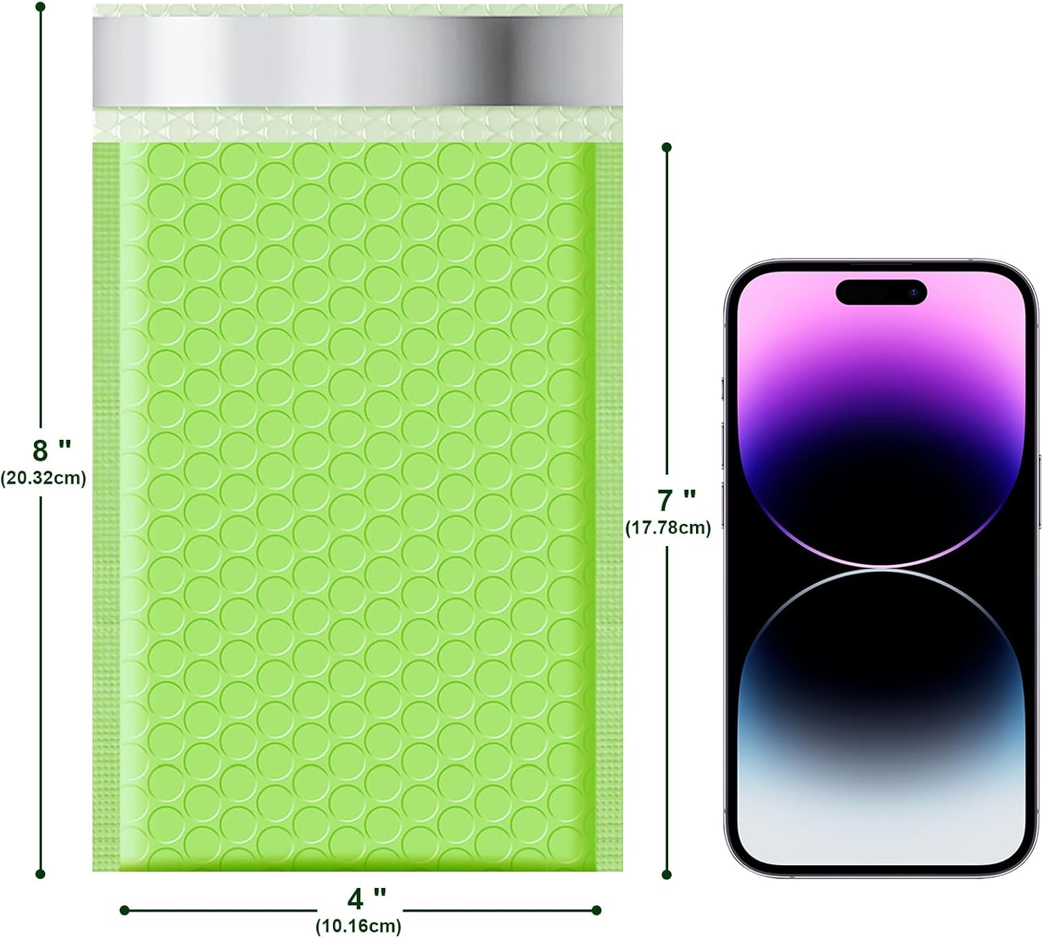 - Compact Private Bubble Mailers-- Usable Space: 4 x 7, Outer Size: 4x8 | Pack of 50 | Color: Light Green. Lightweight polyethylene bubble envelopes cut transportation costs and enhance packaging allure with fashionable colors. Crafted from premium polyethylene, these poly mailers offer absolute privacy protection.