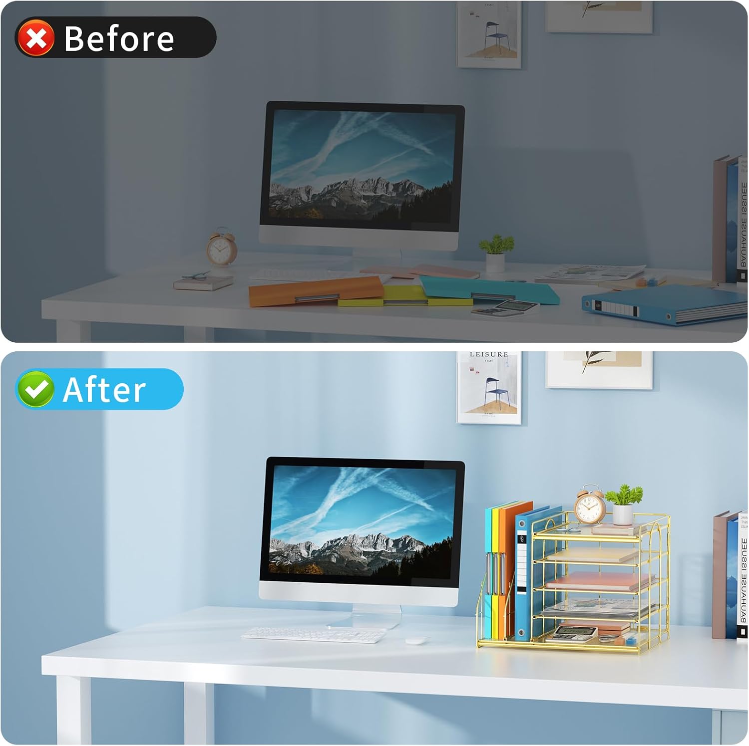 Marbrasse Desk Organizer with File Holder, 5-Tier Paper Letter Tray, Mesh Desk Organizers and Accessories with Magazine Holder, Desktop Organizer and Storage for Office Supplies (Gold)
