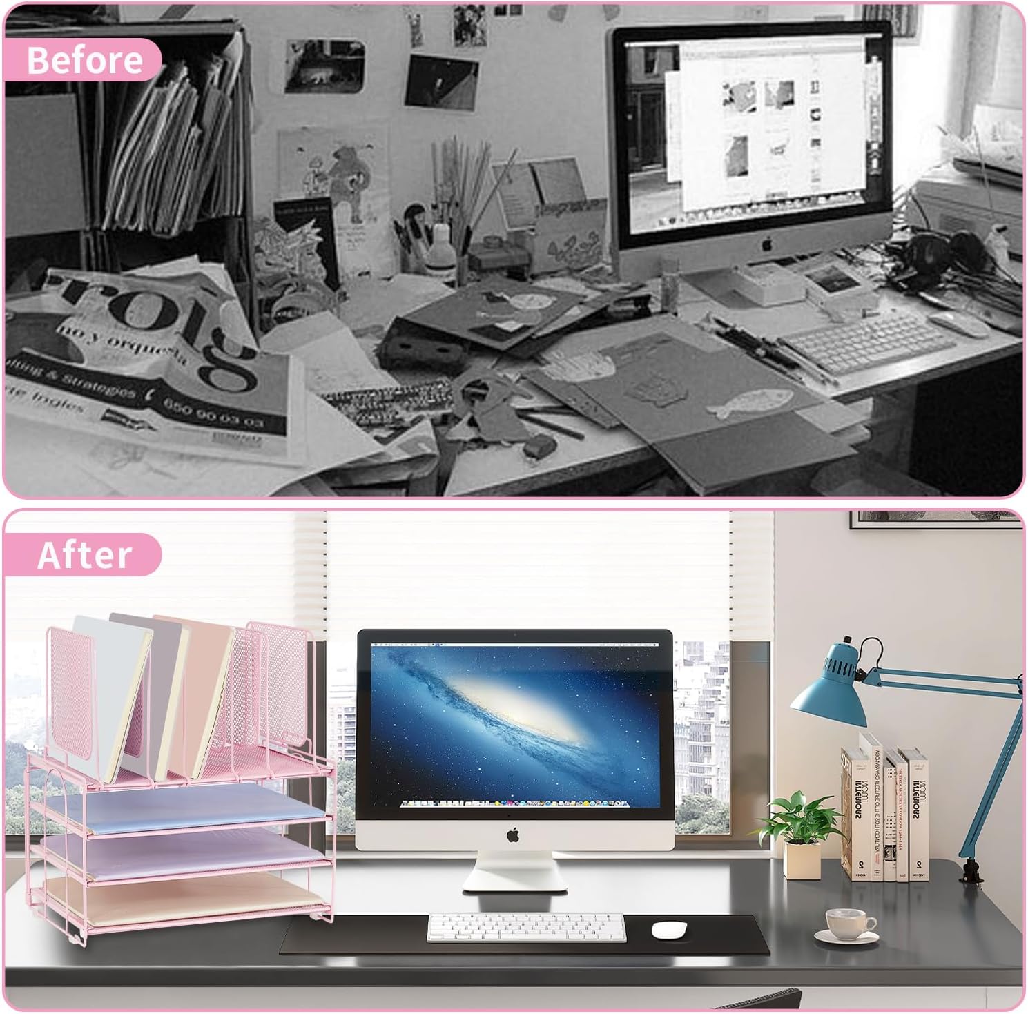 Paper Desk Organizer, 3-Tier Letter Tray with 5 Vertical File Holders, Multifunction Desktop Folder Organizers and Accessories for Home Office(Pink), LK-3CB