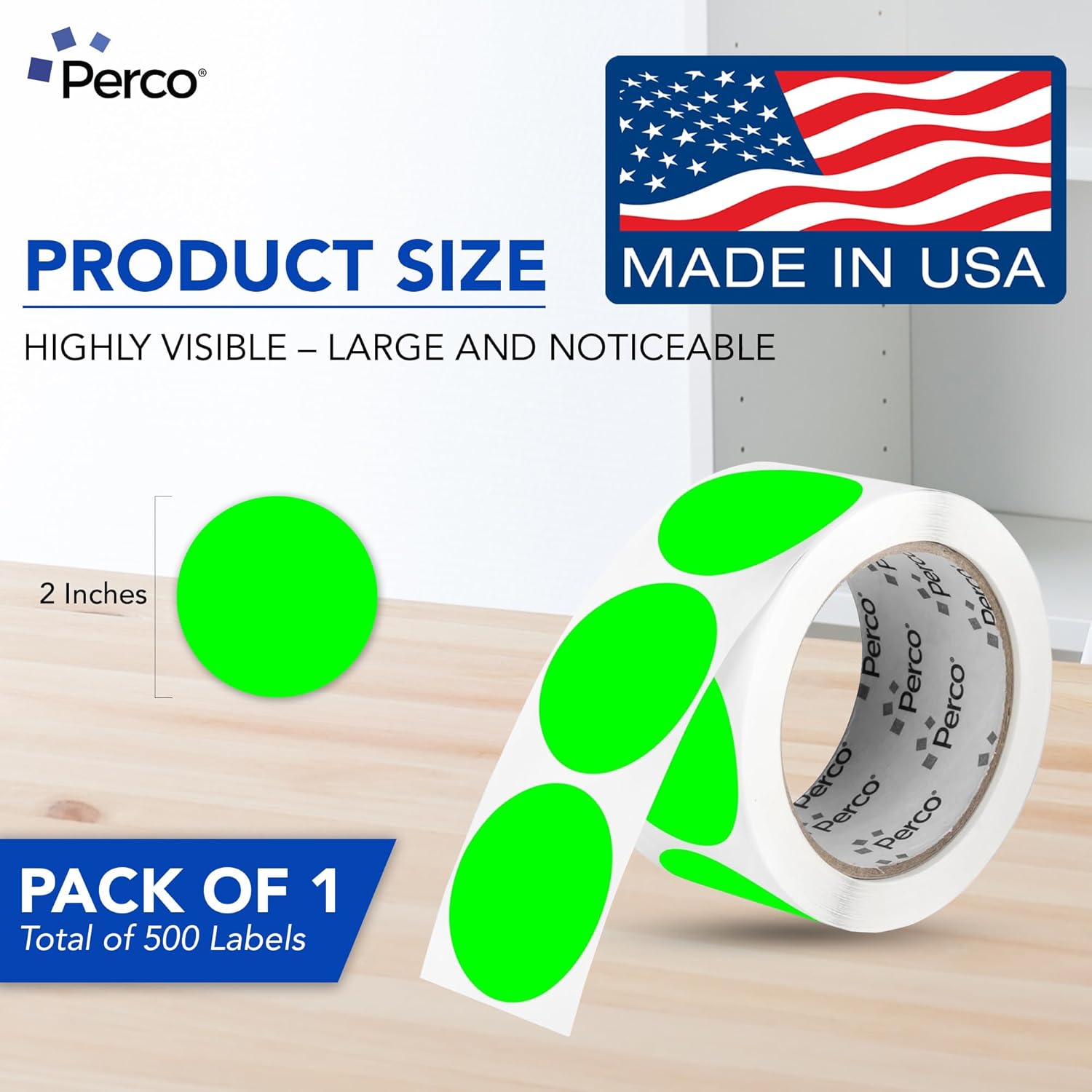 Perco Fluorescent Green 2-Inch Round Circle Dot Sticker Labels with Easy Peel Perforation - 500 Labels per Roll - Strong Adhesion, Vibrant Colors for Organizing, Crafting & More - Made in USA