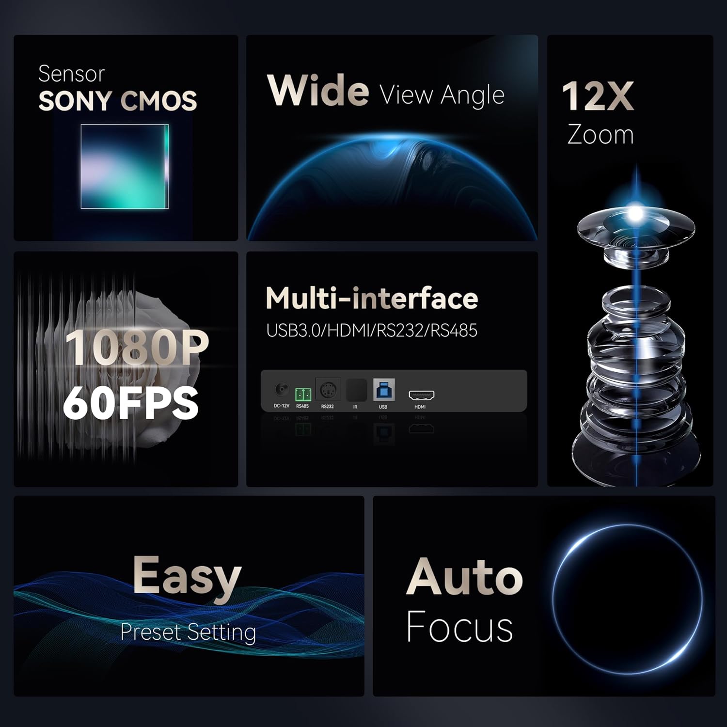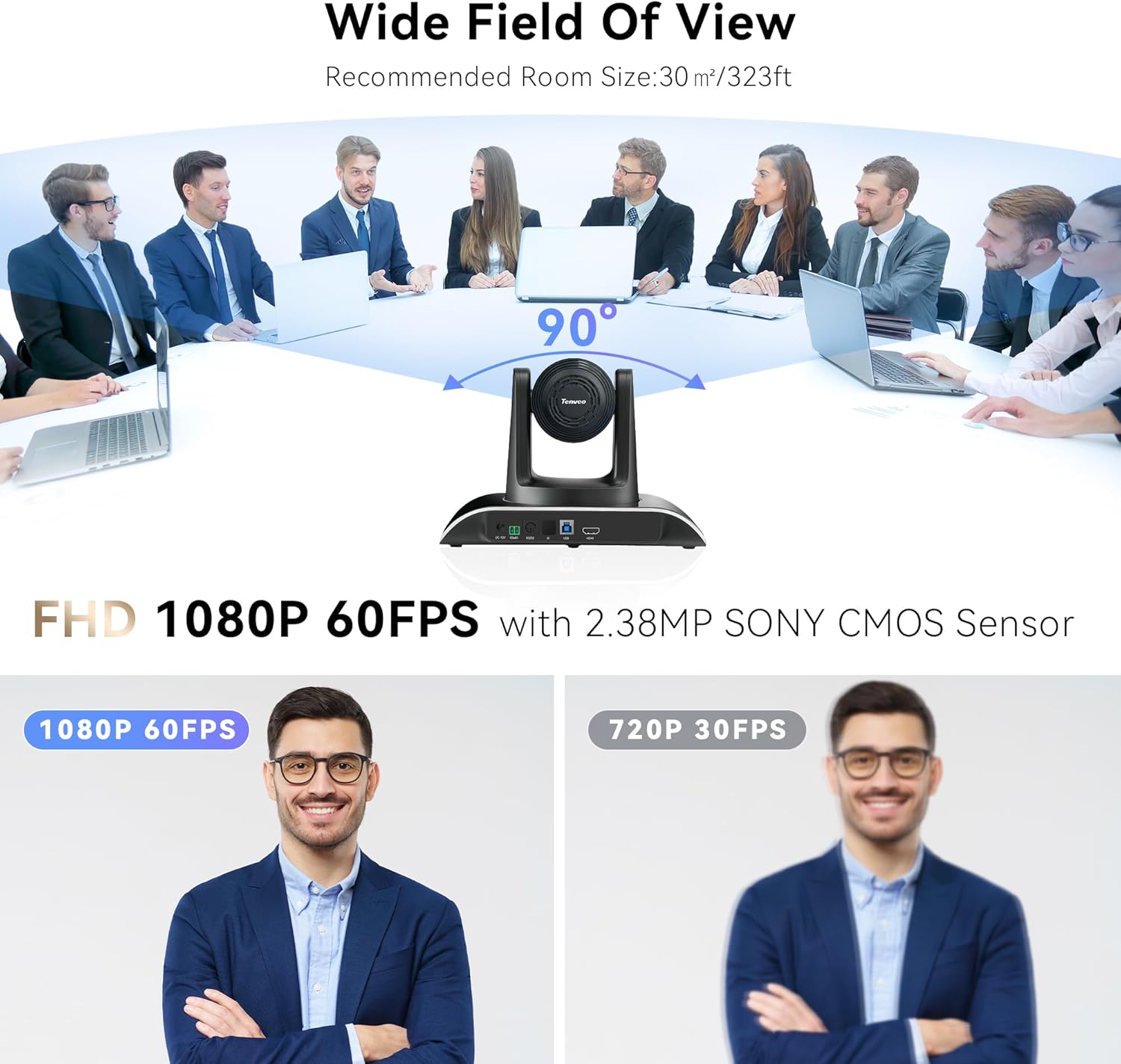 - 🌟【𝟏𝟎𝟖𝟎𝐏 𝟔𝟎𝐅𝐏𝐒 𝐂𝐨𝐧𝐟𝐞𝐫𝐞𝐧𝐜𝐞 𝐂𝐚𝐦𝐞𝐫𝐚】Capture every detail and provide an immersive experience with Tenveo FHD 1080P 60FPS PTZ Conference Room Camera. With its 12X Optical Zoom, 1/2.8'' SONY CMOS Sensor, 2.38 megapixel Lens and 90° FOV, you can now capture stunningly detailed visuals that bring your virtual meetings or events to life. The wide-angle lens ensures that no participant is left out of the frame, while the 12X optical zoom allows for close-ups of key speakers and presenters.