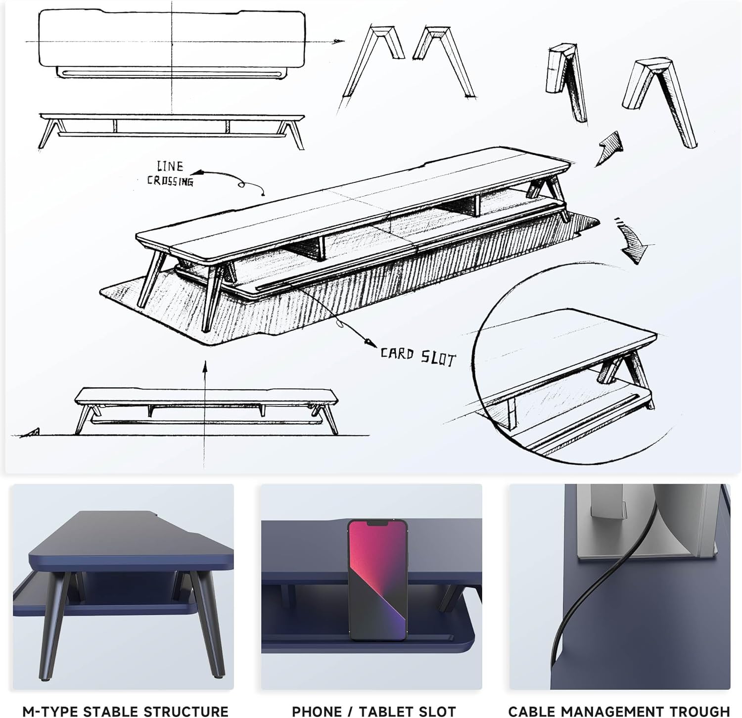 - 【2 TIER DESKTOP ORGANIZER】At longest 42.5inch wide,longer size with more space. This laptop riser is big enough to support two monitors. It has 1 universal device holder slot and 3 high capacity compartments. You can easily store your office accessories & supplies under your monitor stand to keep your desktop tidy. Our monitor stand rise comes with cable management slots that can make your cord stay organized.