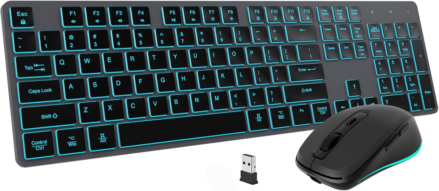 Backlit Wireless Keyboard and Mouse, Rechargeable Quiet Wireless Keyboard Mouse Combo, Jiggle Mouse, 2.4G Cordless USB Keyboard Slim Full Size for Apple iMac, MacBook, laptop and PC, Space Gray