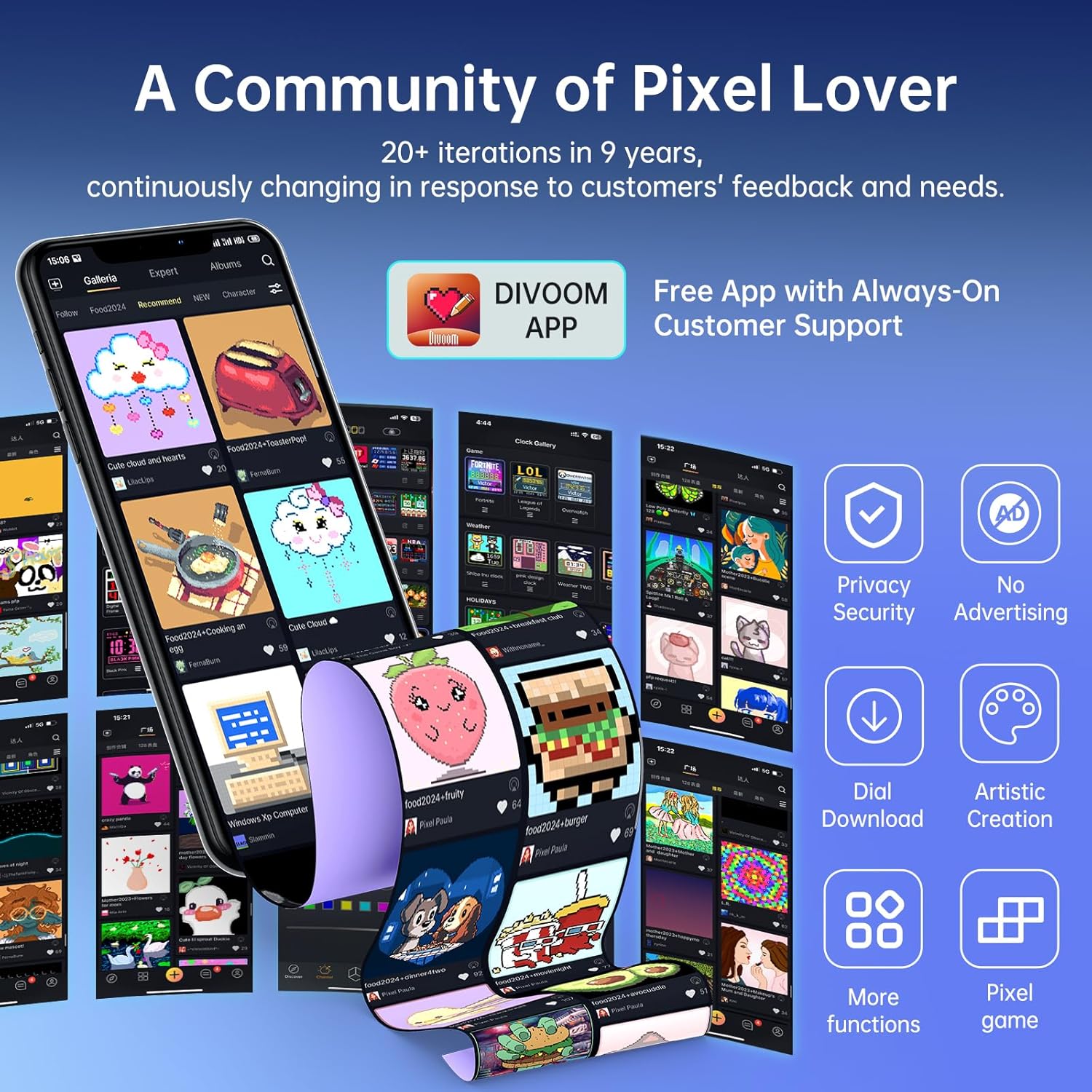 - 【Pixel Art Playground】 -- Unleash your imagination and create personalized pixel art. With a vast library of millions of pixel art designs updated daily, you can effortlessly customize your display with animated graphics, text, and more, it's a canvas that reflects your unique style and creativity. The Times Gate is more than just a cool RGB led display, it's a symbol of the seamless integration of life and technology.