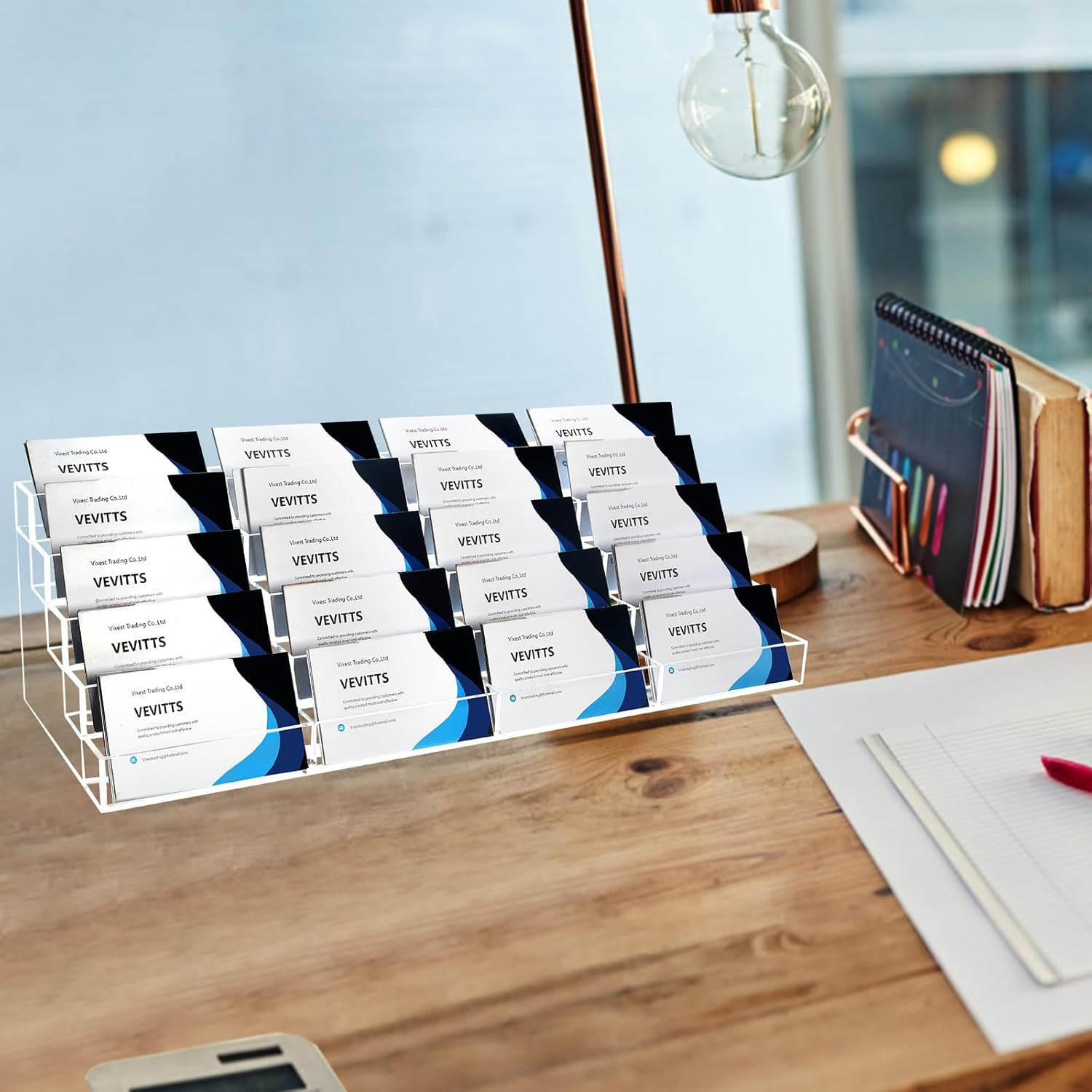 - Convenient and Effective Design: card holder stand is designed into 5 tiers and 20 slots in total, convenient for you to put or take out business cards; Clear color design make it easy to find the business card you need, make your business life convenient and effective.