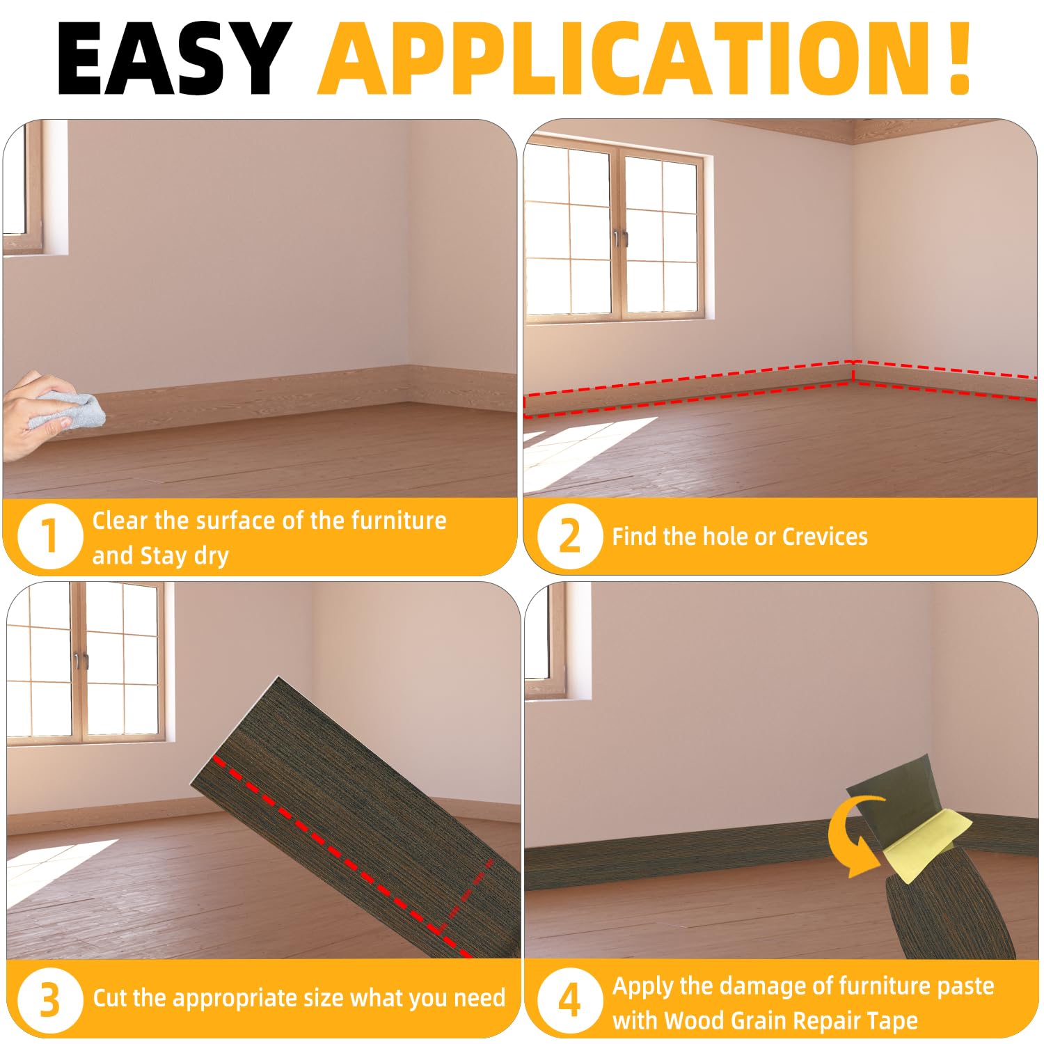 - High Quality - The Wood Grain Repair Tape is made of high quality Self Adhesive, which is durable and elastic, with a smooth surface and not easy to be dirty.When you repair Tables, Chairs, Baseboards, Doors, Windows, Floors, All Kinds of Furniture Renovation, Wood Grain Repair Tape will be your first choice