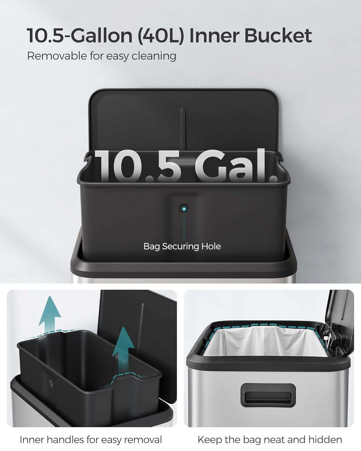 - [Practical Inner Bucket] Equipped with handles, the inner bucket can be removed for easy cleaning and liner change. Moreover, the bag hole at the back not only secures the bag in place but also keeps it hidden from view