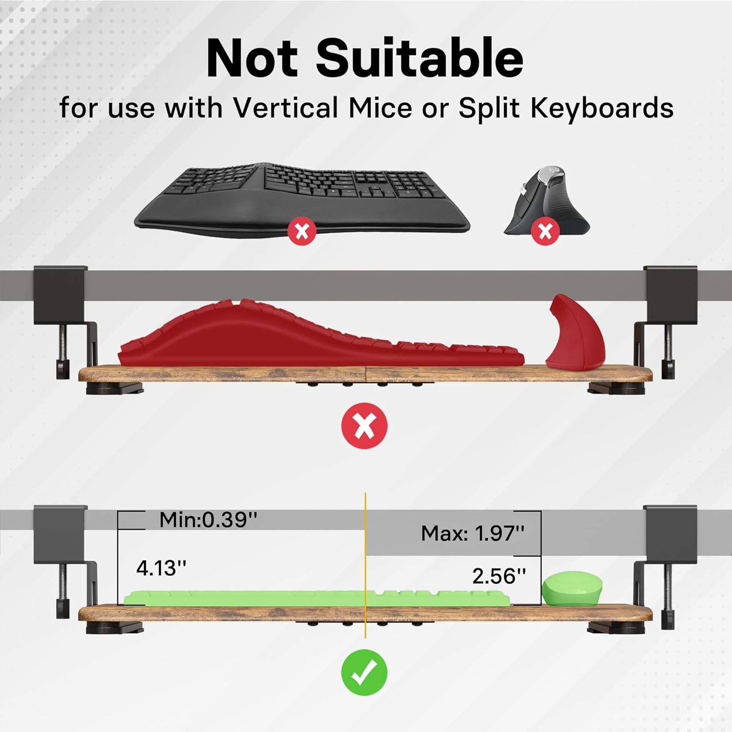 - ❗️ CHECK DESK COMPATIBILITY BEFORE PURCHASE – This under-desk keyboard tray won’t work with desks that have curved, beveled, or rounded edges, or crossbars/support beams underneath. Please check the product images to ensure your desk has a flat, unobstructed underside for clamp installation