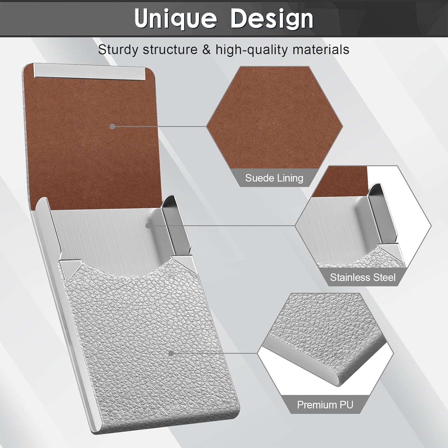 - Material: Our business card holder made of luxury PU leather and high quality Stainless Steel. It has a good solid construction, use longer.