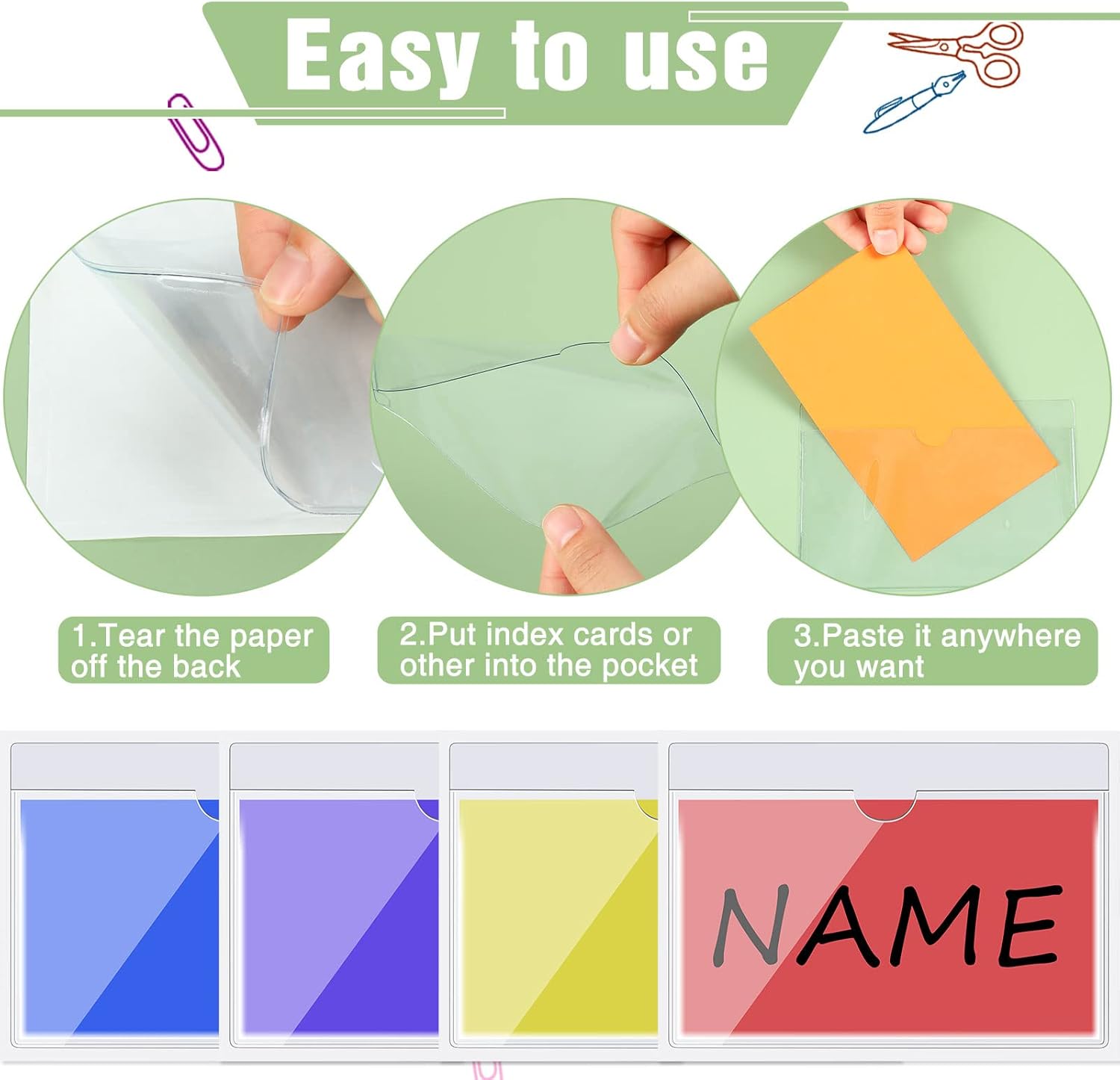 - Stay Organized: the self adhesive index card pocket can keep order by inserting your cards into plastic sleeves and attaching them wherever you need them; Our self-adhesive cards are suitable for making library labels, self adhesive name tags for classroom, toy labels for bins with pictures, labels for plastic storage bins and other