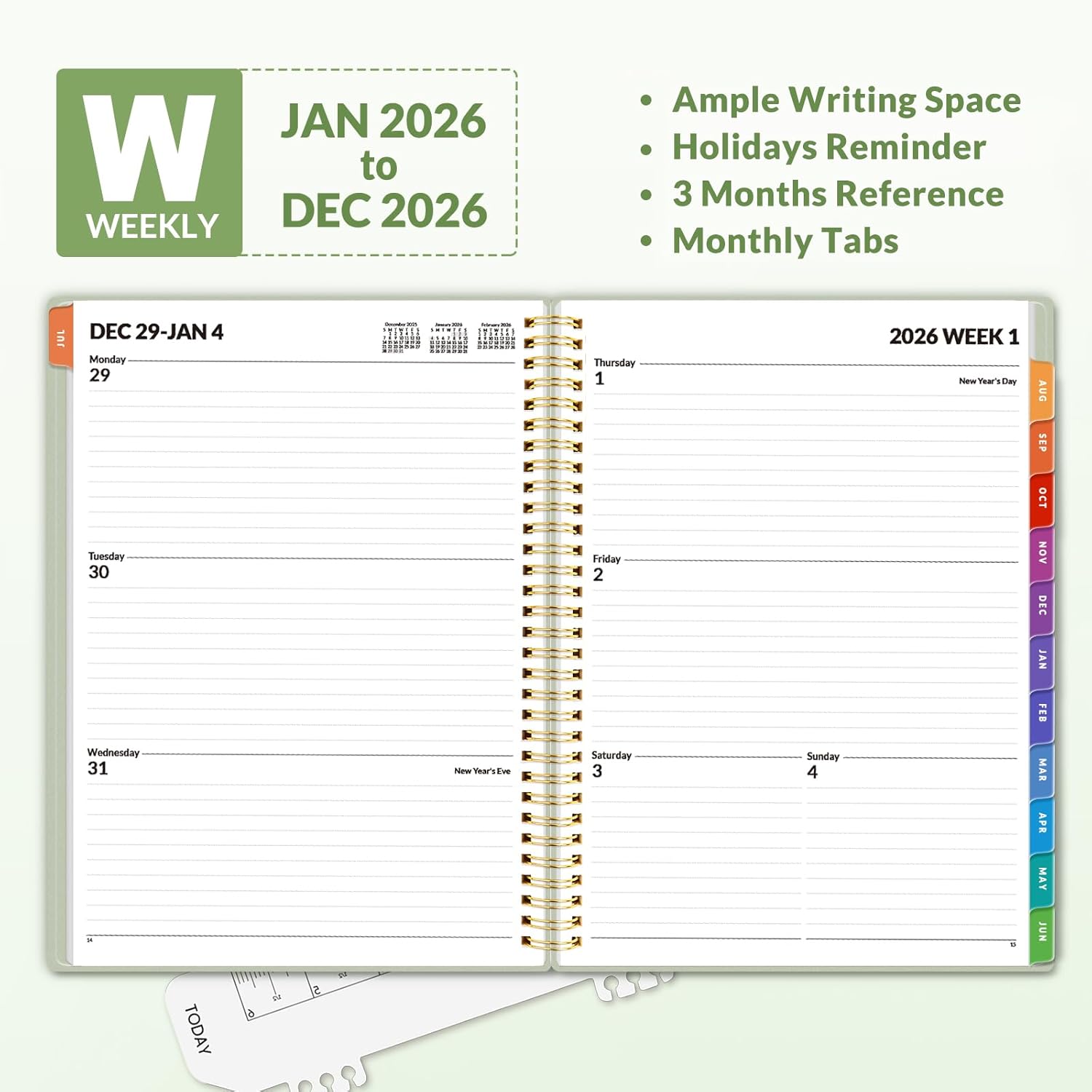 SUNEE 2026 Weekly and Monthly Planner - from January 2026 - December 2026, 8.5"x11" Daily Agenda Planner with Monthly Tab, Flexible Cover, Note Pages, Pockets, Bookmark, Spiral Binding, Sage Green