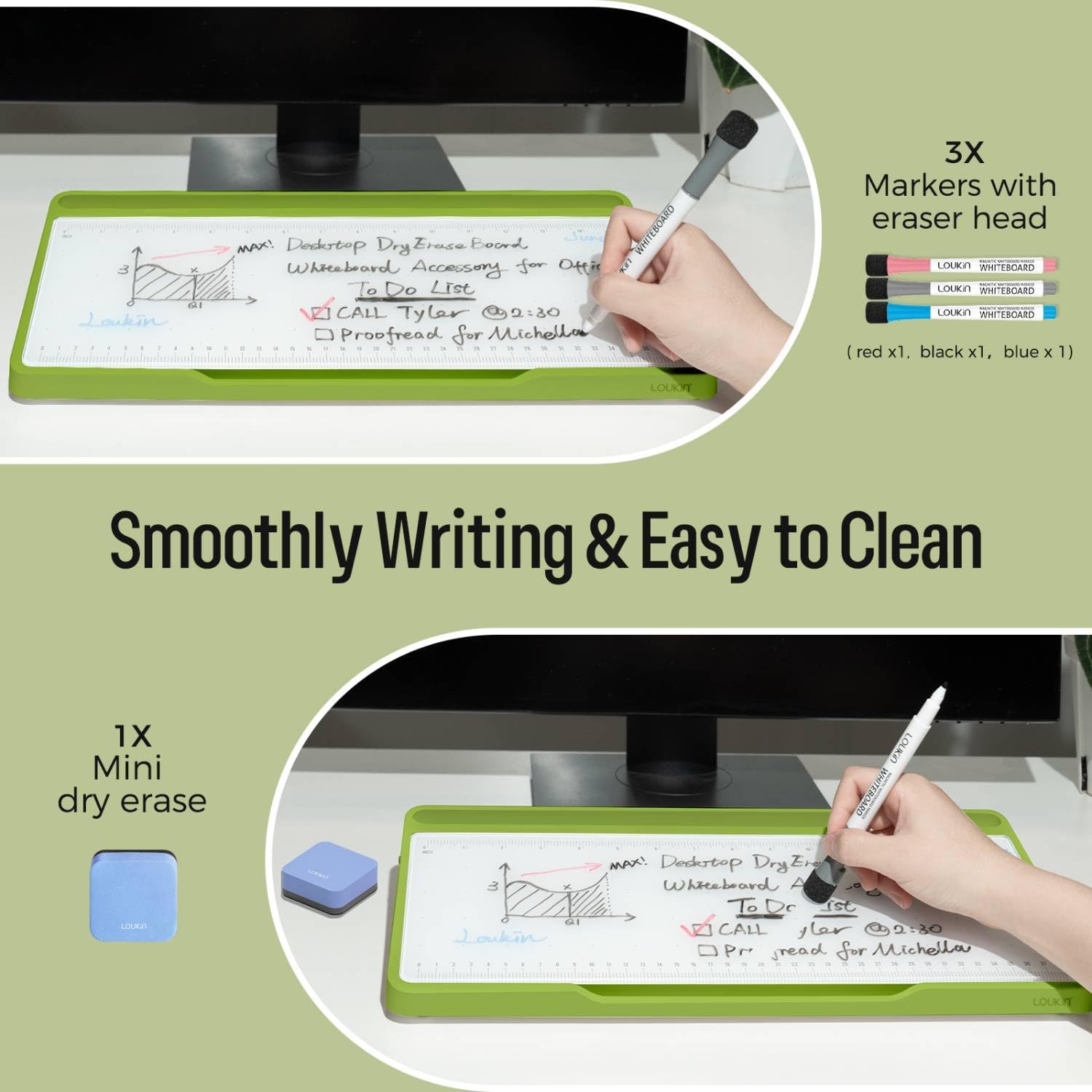 LOUKIN Glass Desktop Whiteboard, 15.3" x 5.6" Dry Erase Desk Board with Dotted and Graduated Surface, Desktop Buddy, Great for Design and Drawing, 3 Markers and 1 Dry Erase Eraser Included (Green)