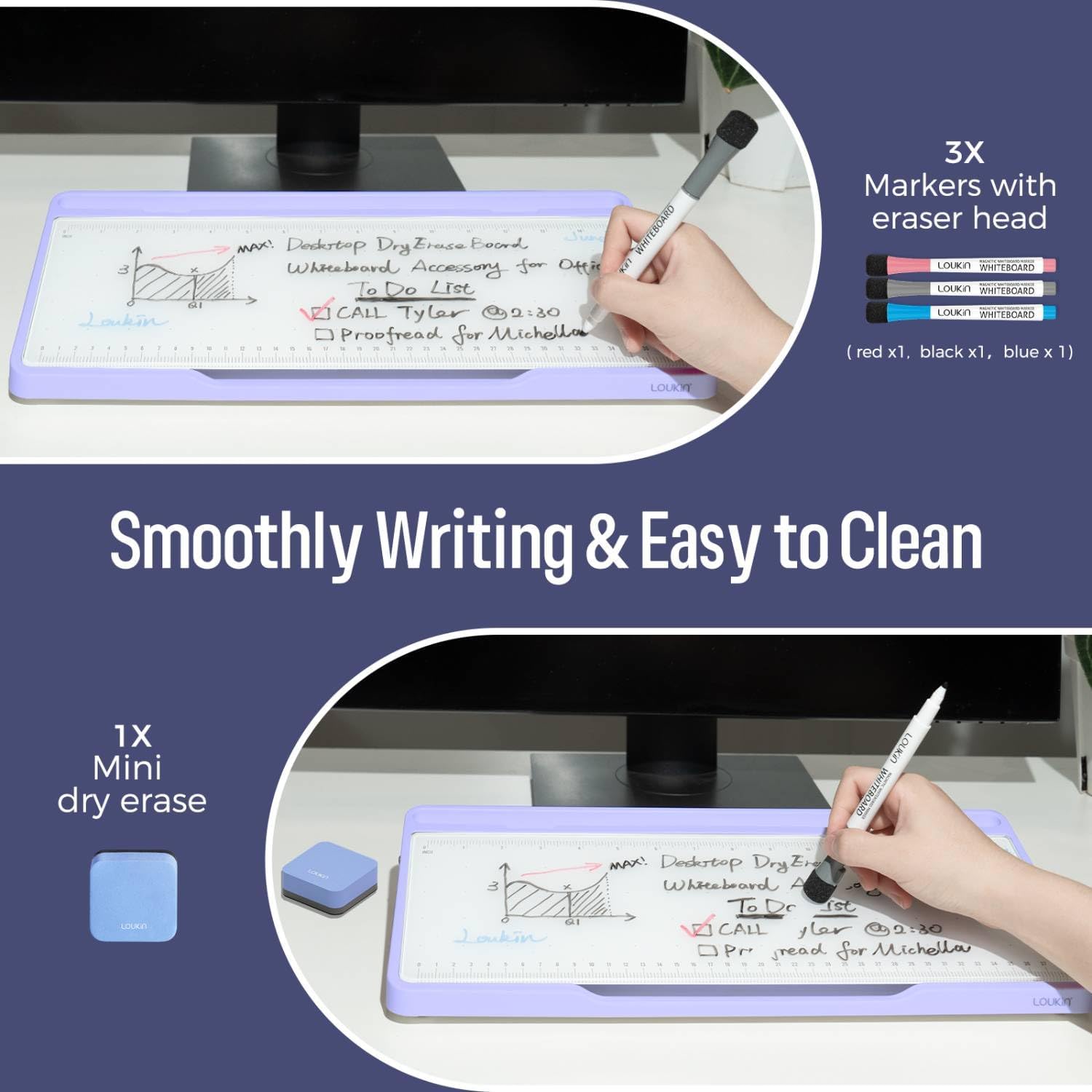 LOUKIN Glass Desktop Whiteboard, 15.3" x 5.6" Dry Erase Desk Board with Dotted and Graduated Surface, Desktop Buddy, Great for Design and Drawing, 3 Markers and 1 Dry Erase Eraser Included (Purple)