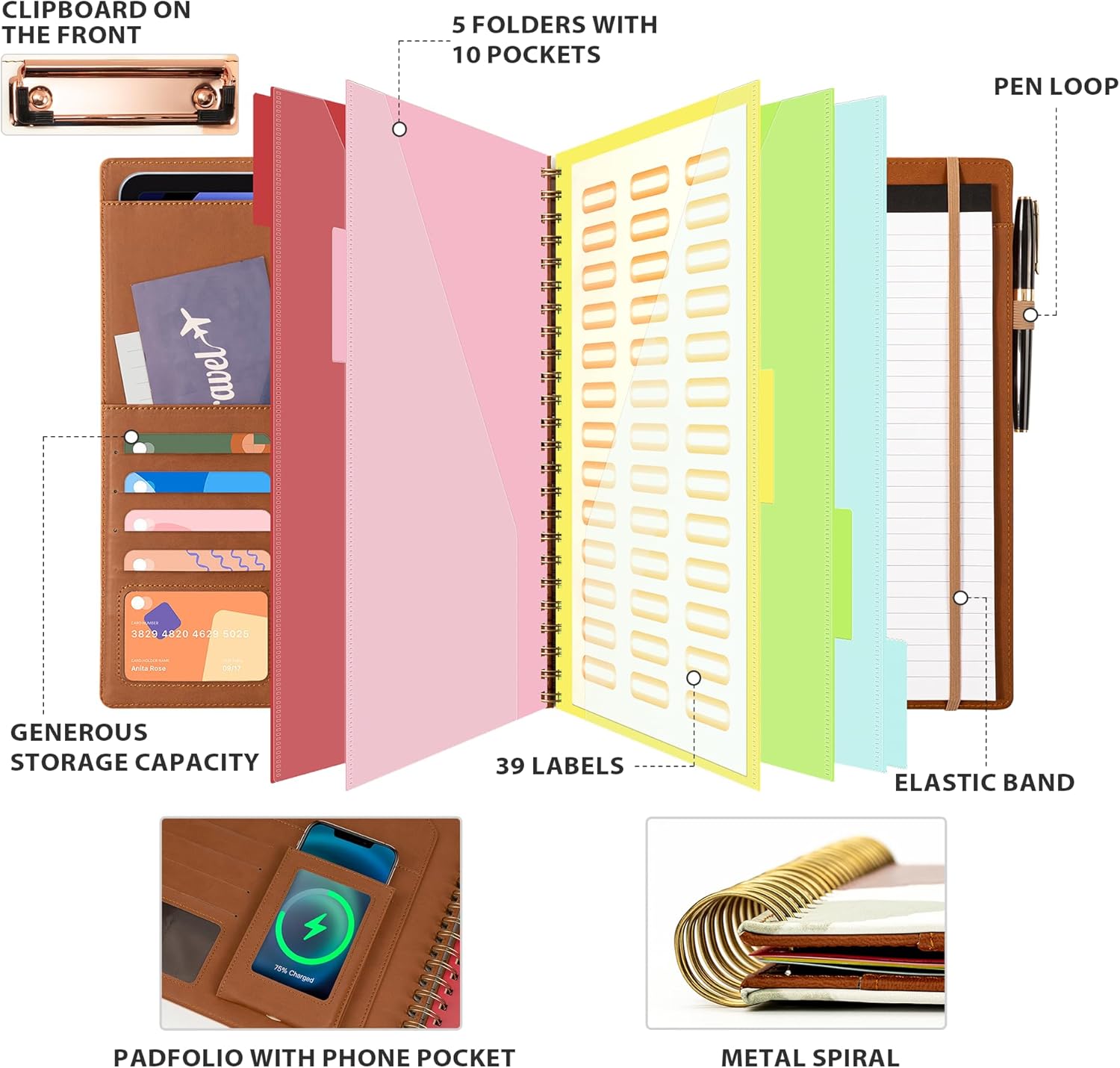 - Versatile Organizer with Large Capacity - Our clipboard with storage is 360°ー foldable and features a retractable transparent phone pocket (with a charging port) that can accommodate a 6.7" phone, the pockets on the left side are of big capacity to hold your cards, passport, ipad and other valuables. It also offers 5 folders and divider with index stickers on the right side to keep your files well organized, which is perfect for all your daily routines and business travel needs