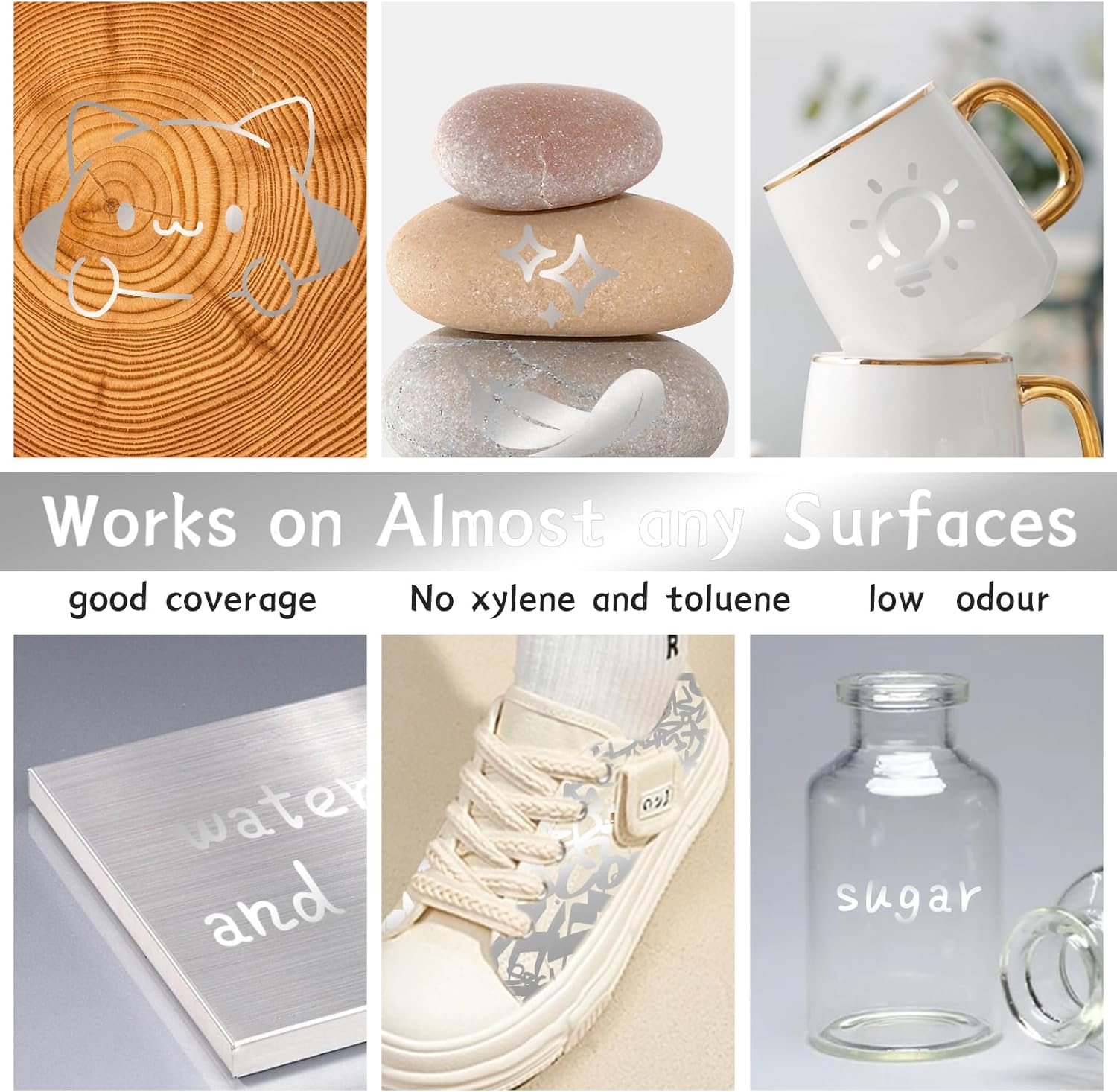 - Silver Paint Markers: Silver paint pens are made up of a long-lasting oil-based opaque ink, Low odor. The ink resists fading, water and abrasions, designed to stand out on both light and dark surfaces. Paint markers can be used on glass and once dry they will be permanent and waterproof