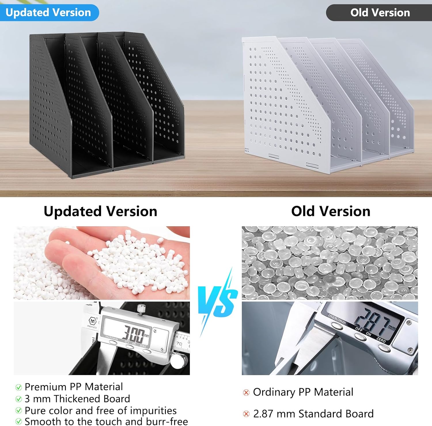 - STURDY AND DURABLE: The stand book organizer is made of premium PP material with 3 mm thickened dividers, strong and stable structure, strong load-bearing capacity. The surface of the file sorter is flat and smooth without hurting your hands. Each slot is 3 inches.
