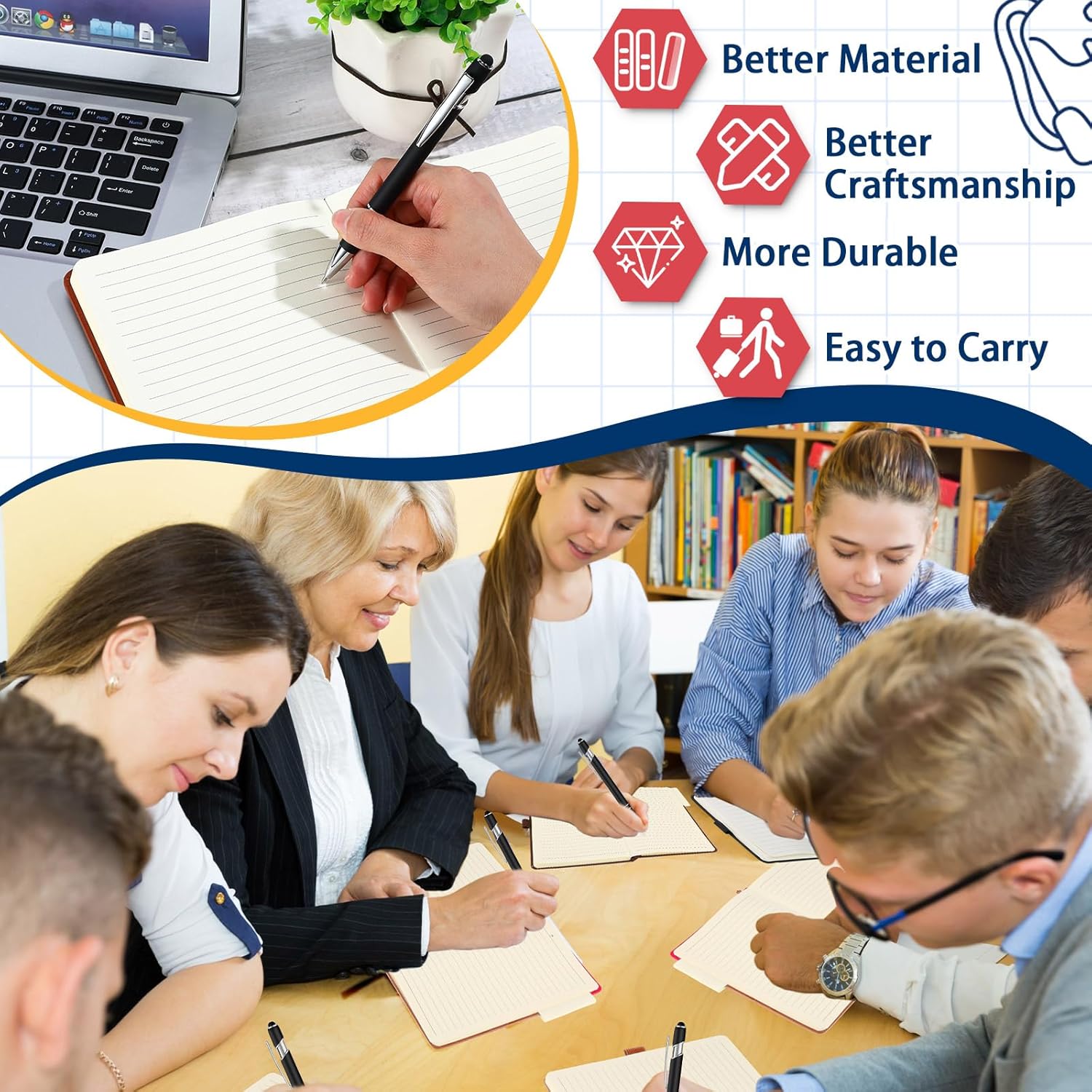 - Retractable Pens: these pens fit into the pen holder of the classic lined notebook; The large tube has the ability to hold more ink, making them long lasting and quick dry, which can avoid smudging, and the other end of the pen can touch the screen