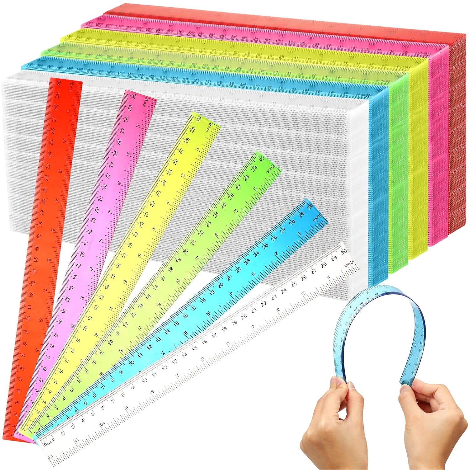 Fumete 600 Pack 12 Inch Plastic Rulers Bulk for Classroom Back to School Supplies Flexible Transparent Assorted Color Ruler with Centimeters and Inches for Office Teacher Student