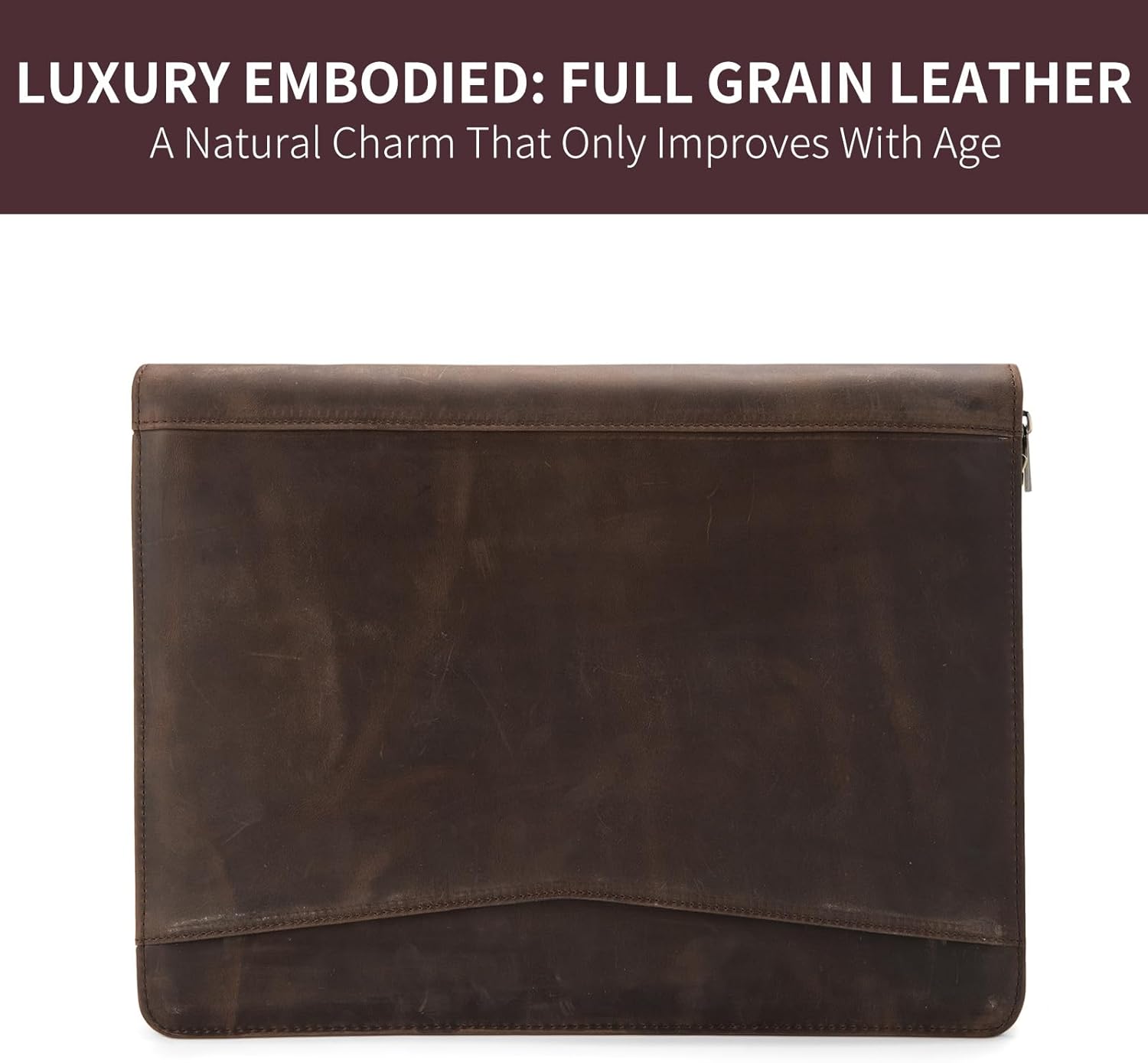 - Effortless Organization: To enhance your daily efficiency, this leather portfolio includes 2 pen loops for easy access to writing instruments, 2 business card slots for networking essentials, an earbud pocket for tangle-free earphone storage, and a dedicated cell phone holder, ensuring all your essentials are readily accessible and neatly organized. Say goodbye to disorganized bags and hello to a more streamlined and efficient workday.