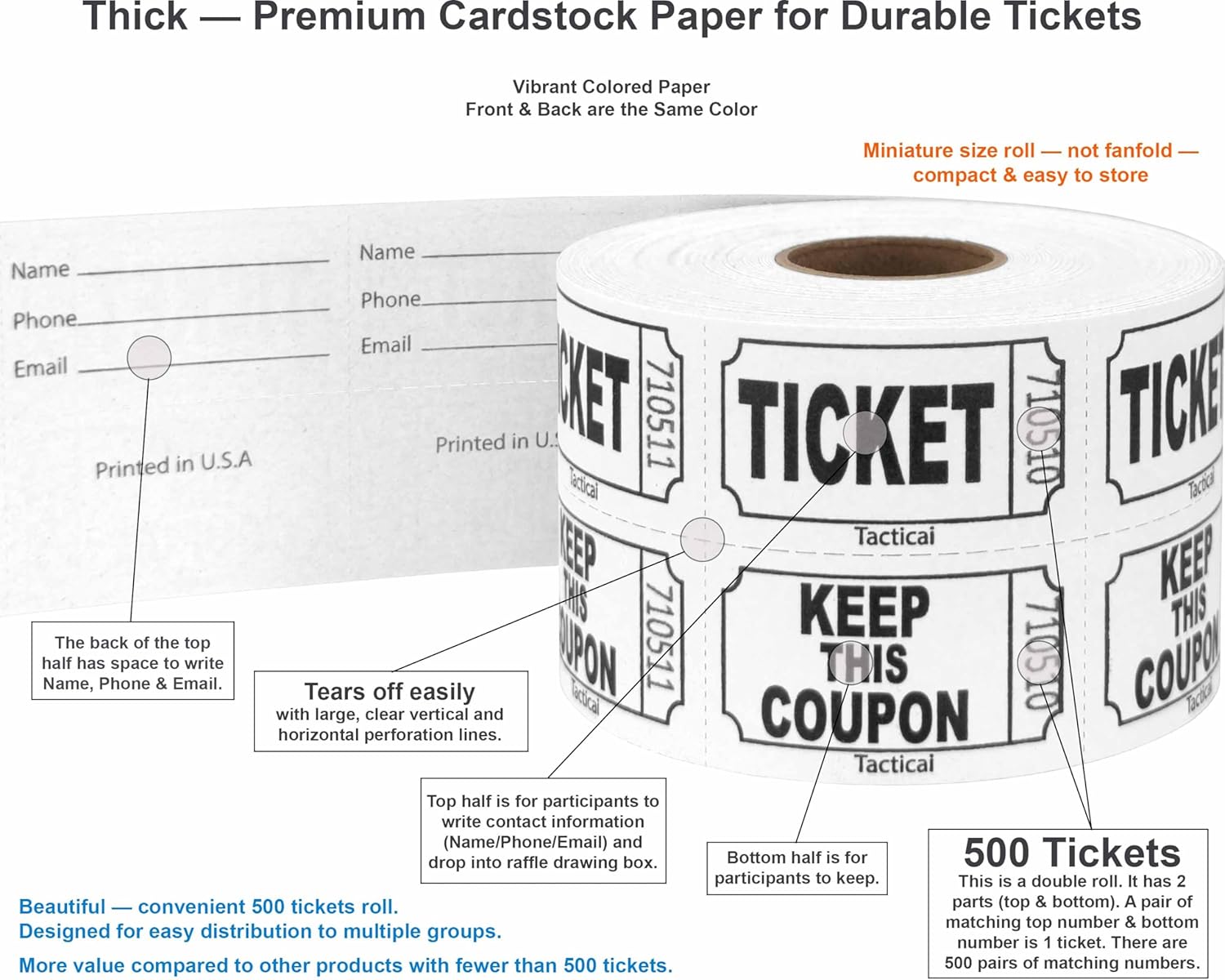 - RAFFLE OPTIONS & EASY TEAR – Each double roll contains 500 tickets. The double roll providing matching numbers for deposits and reference use with quick contact option. The perforations make it easy to tear them off. Discover the ultimate ticket size for convenience and functionality with our 2" x 1.75" ticket, which can be split into two 1.75” x 1” halves. Its compact design is perfect for holding in your hand, wallet, or pocket, making it the ideal choice for all your events.