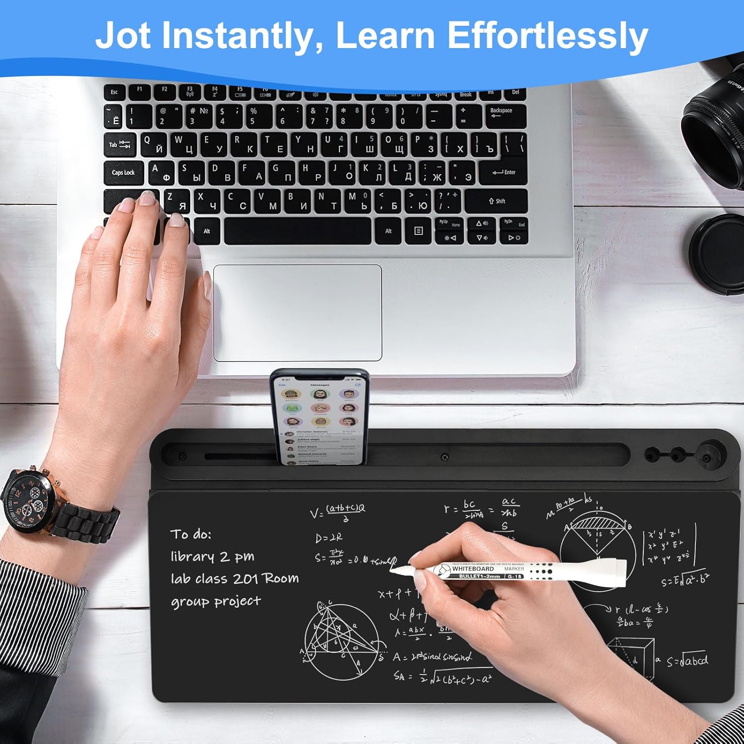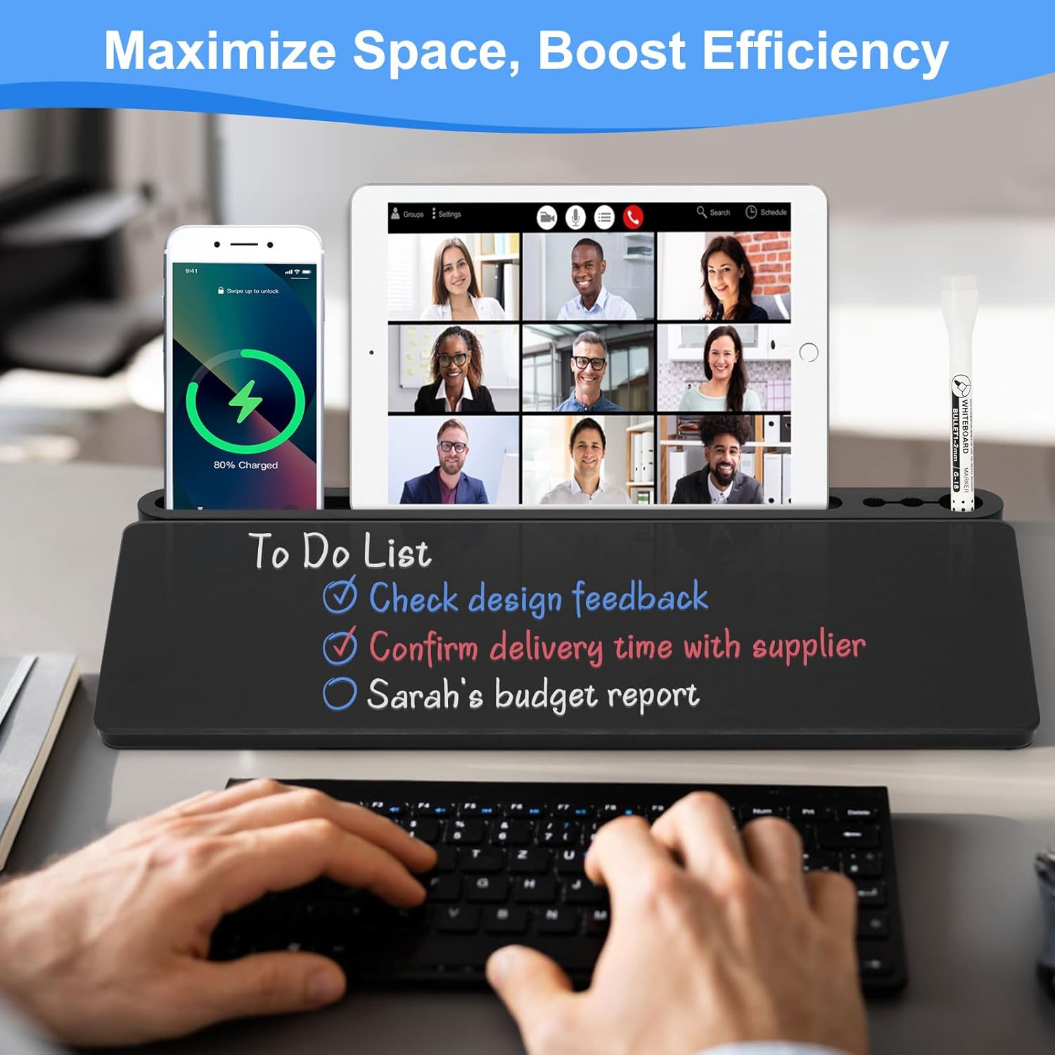 - Multiple Functions - To enhance the overall convenience of the product, this whiteboard includes 1 large pen holder, 2 small pen holders and 1 slot on the top which can hold 3 markers, a tablet and a phone. Equipped with charging port notch in the slot, the desk board is a good option to realize office charging, and you can charge your phone quickly. This dry erase board is more ergonomic with the perfect ramp design and non-slip design, which can make itself be used as keyboard pad.