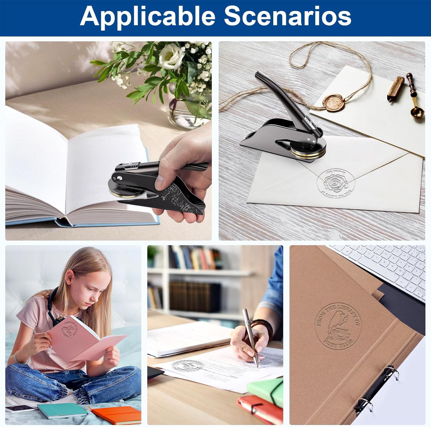 - Custom Book Embosser: To customized your book stamps, simply enter your text in the customization options, select or transfer your logo, and we do the rest.