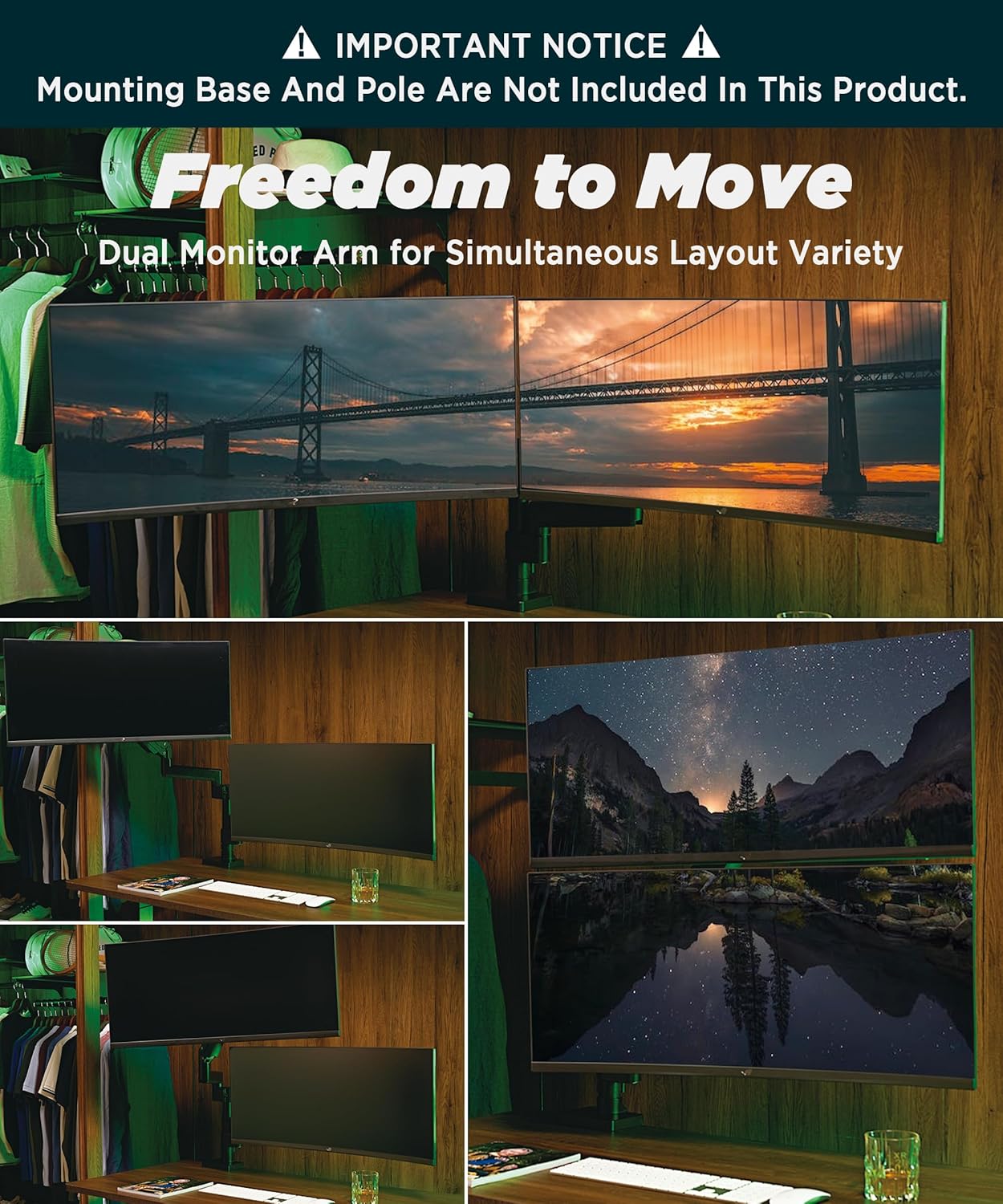 - Modular Extension Arms - The base with extra tall pole has 88 pounds mounting capability, which can be upgraded to a dual monitor mount or triple monitor mount. Dual stacked monitor mount fits up to two 49" ultrawide monitors. Triple monitor stand fits two stacked monitors and a sideways monitor.