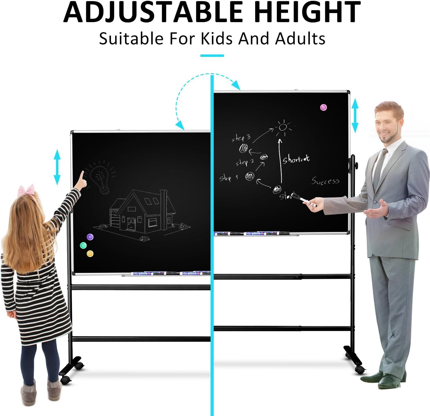 - 【MULTI-FUNCTIONAL USAGE】The double-sided design, 360° rotation, and automatic lock function offer flexible use, allowing users to flip the board to get more use area and retrieve information faster, The rolling stand-on wheels with a locking system make it easy to move and fix the board anywhere, anytime